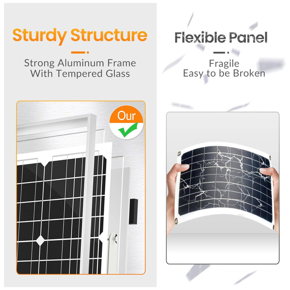 Excelente qualidade O painel solar de 20W adota células monocristalinas bem construídas com alta eficiência de conversão de até 24. Usando vidro temperado, filme à prova de intempéries e moldura de alumínio para excelente uso externo prolongado, que pode resistir a tempestades por mais de 10 anos.