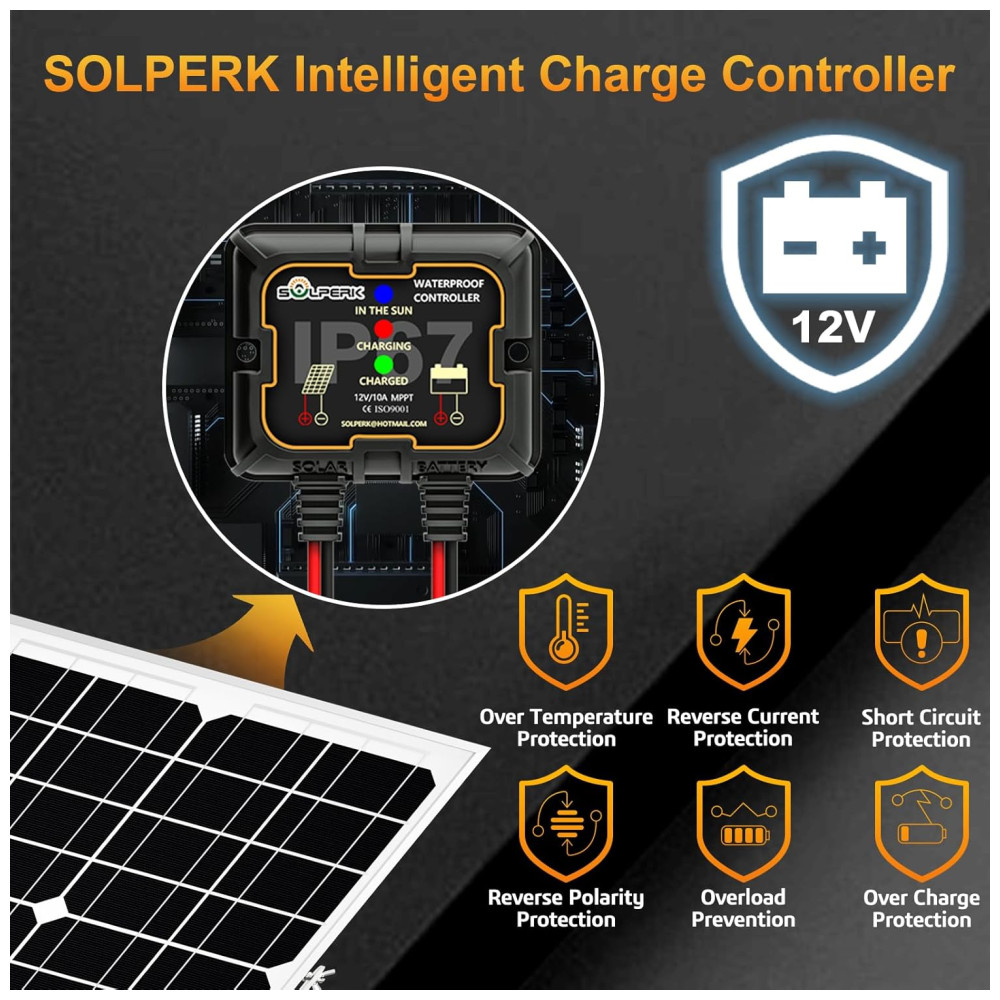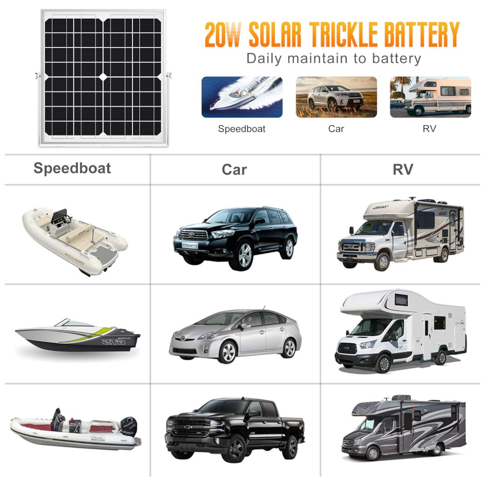 Ampla aplicação Pode ser como carregador de bateria solar e mantenedor para diferentes baterias de 12V DC, como Wet, Gel, MF, EFB e AGM. Uma variedade de cenários para RV, carro, barco, marinho, campista, cortador de grama, motocicleta, jet ski, bomba dágua, galpão, abridor de portão, etc.
