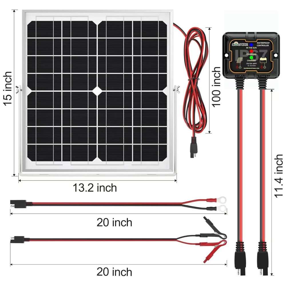 O que você obtém 1 painel solar, 1 controlador regulador do carregador solar, 2 garras jacaré, 1 cabo de extensão SAE e 1 conjunto de peças de montagem
