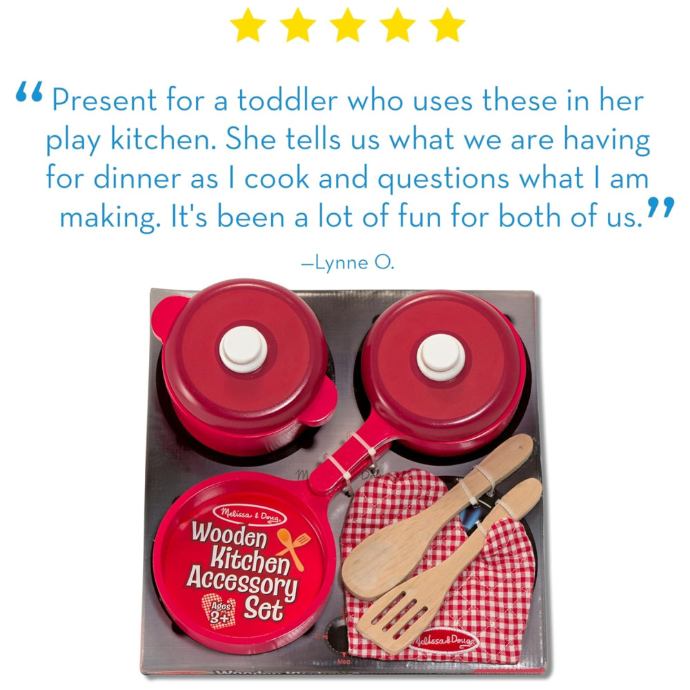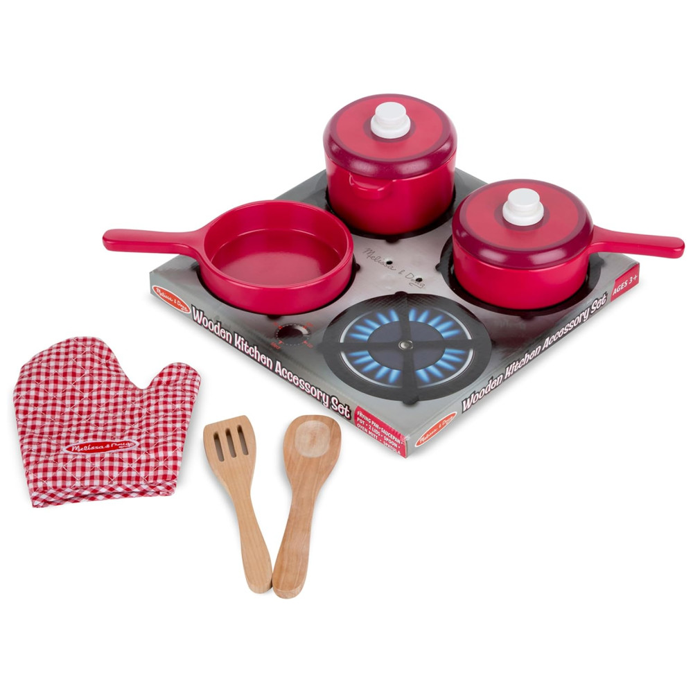 O conjunto de acessórios de cozinha de madeira Melissa Doug Deluxe é perfeito para crianças que adoram brincar de cozinhar Composto por 8 peças, o conjunto inclui uma frigideira, uma panela e uma panela com tampa, além de uma colher, uma espátula com fenda e uma luva de forno.