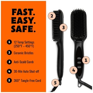 Design anti escaldadura para proteção da pele O design anti escaldadura da nossa escova para alisar a barba protege a pele do calor.