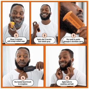 Todos os elementos essenciais de que você precisa para endireitar sua barba Nosso kit para alisar barba contém um alisador de pente anti escaldadura, spray de proteção contra calor, sabonete para barba, bálsamo para barba e um pente para desembaraçar. Embalado em uma caixa de zenamento, é um maravilhoso conjunto de barba para presente.