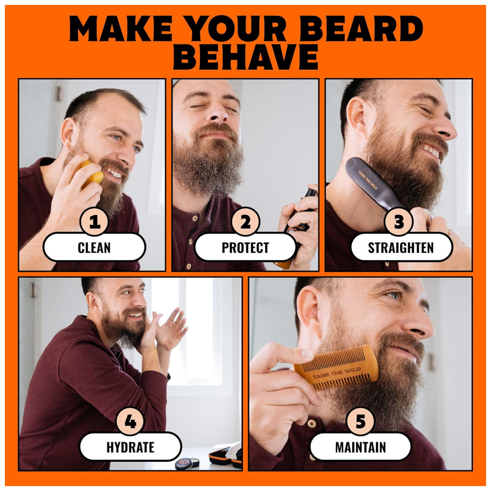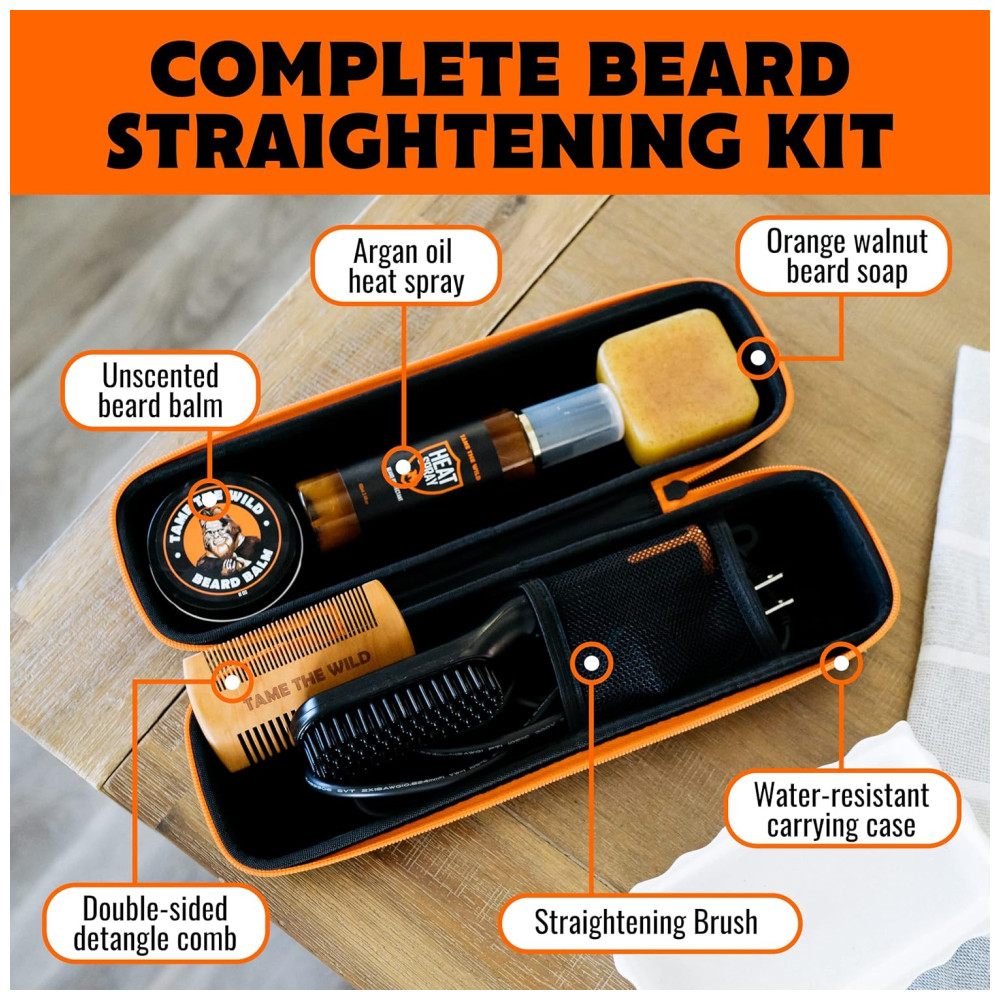 Kit Alisador de Barba Tame the Wild Sem Fio Escova Aquecida Pente de Madeira Balm Sabonete Spray Protetor Térmico Estojo Preto