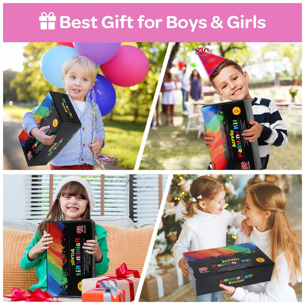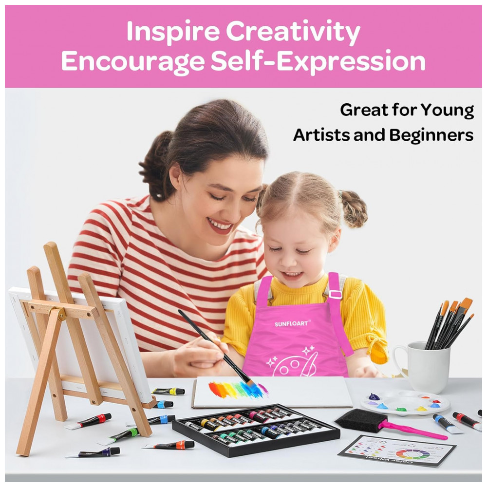 Este kit de pintura acrílica MMARTE com 59 peças reúne tintas, cavalete em madeira, pincéis, telas e bloco de canvas, indicado para crianças, iniciantes e artistas em atividades de pintura em acrílico. A seleção inclui 24 cores de tinta acrílica lavável e não tóxica em tubos de 12 ml, prontas para uso em painéis e telas.