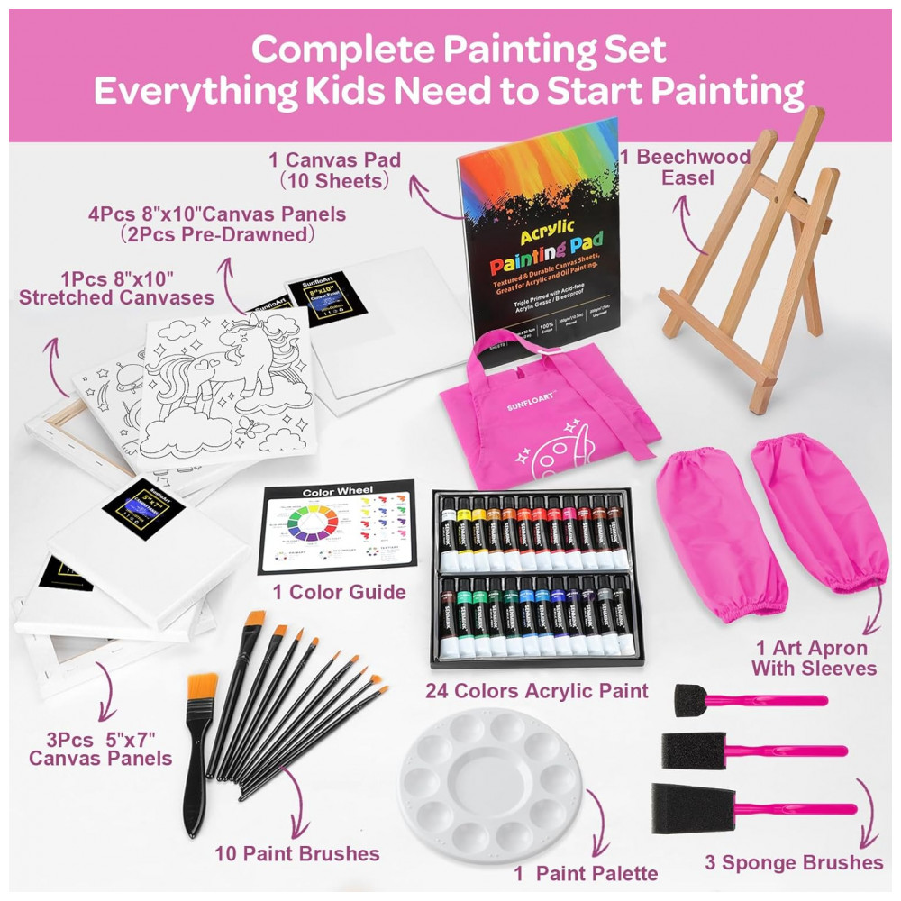 Kit pintura acrílica 59 peças MMARTE rosa com 24 tintas cavalete em faia pincéis telas e bloco de canvas