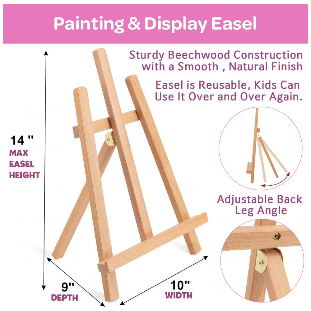 O conjunto traz um cavalete de mesa em madeira de faia maciça fornecido montado, adequado para apoiar telas no formato 20,3 cm x 25,4 cm e 12,7 cm x 17,8 cm durante a pintura. Acompanha 10 pincéis de cabo curto, 3 pincéis de esponja, paleta para mistura, bloco de 10 folhas de canvas no formato 22,9 cm x 30,5 cm, quatro painéis de canvas 20,3 cm x 25,4 cm, três painéis 12,7 cm x 17,8 cm e uma tela esticada 20,3 cm x 25,4 cm.