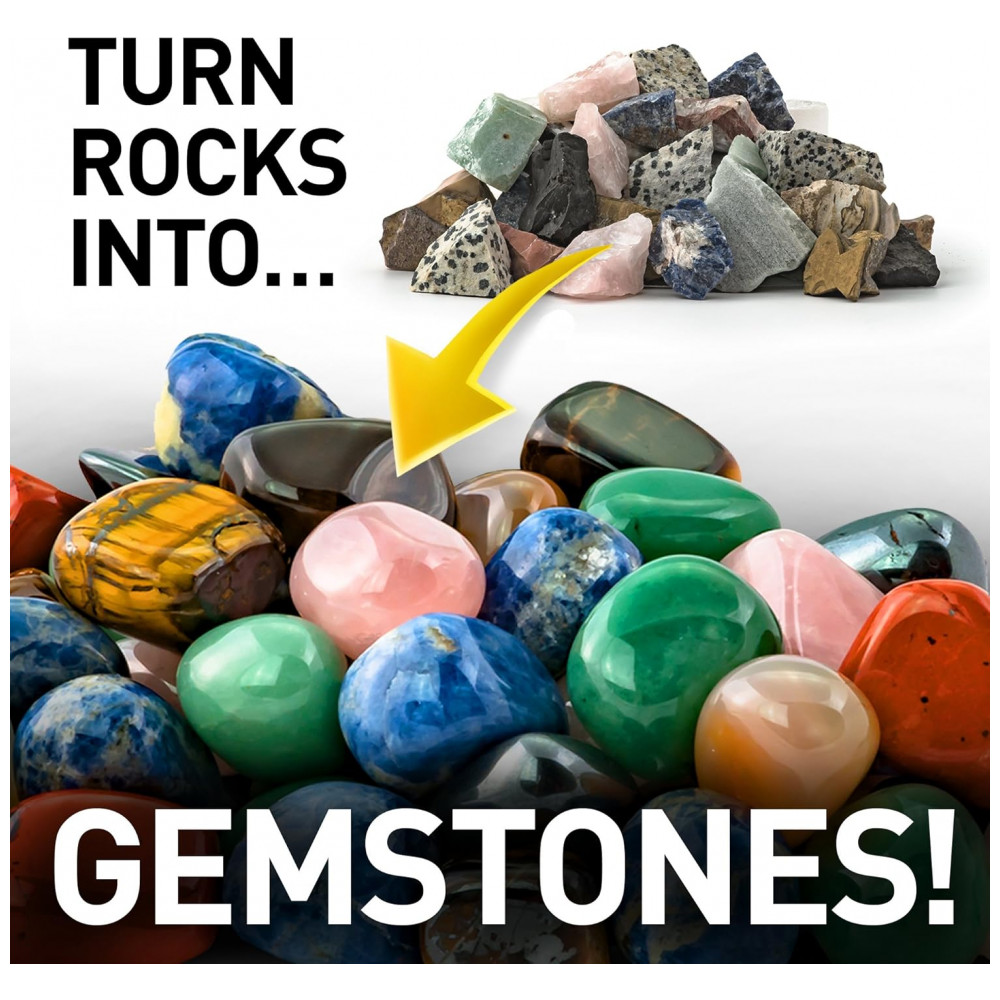 Inclui: tambor de borracha à prova de vazamentos, motor com desligamento automático, adaptador AC, 9 tipos de pedras brutas reais, 4 tipos de grãos abrasivos, acessórios de joalheria e guia ilustrado colorido