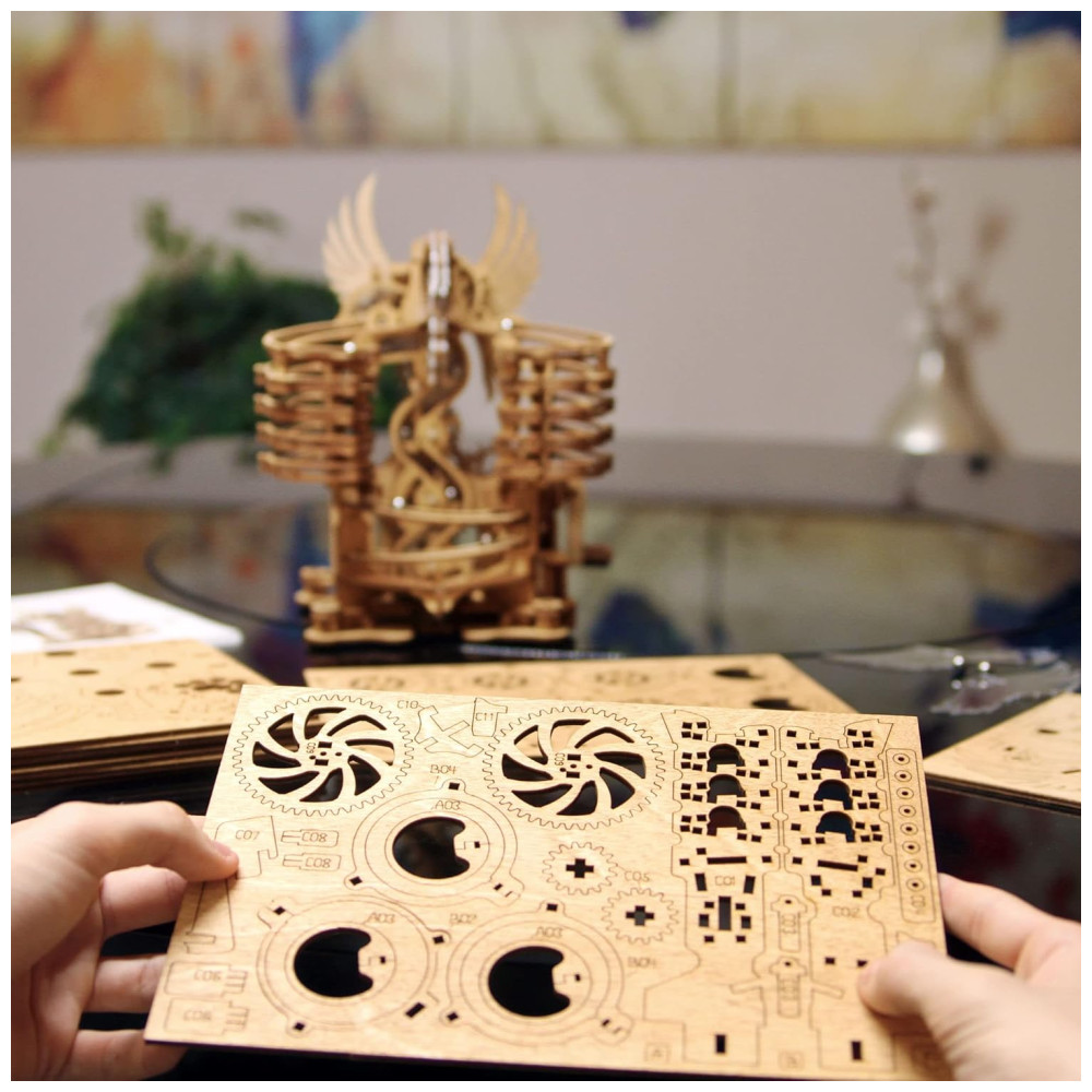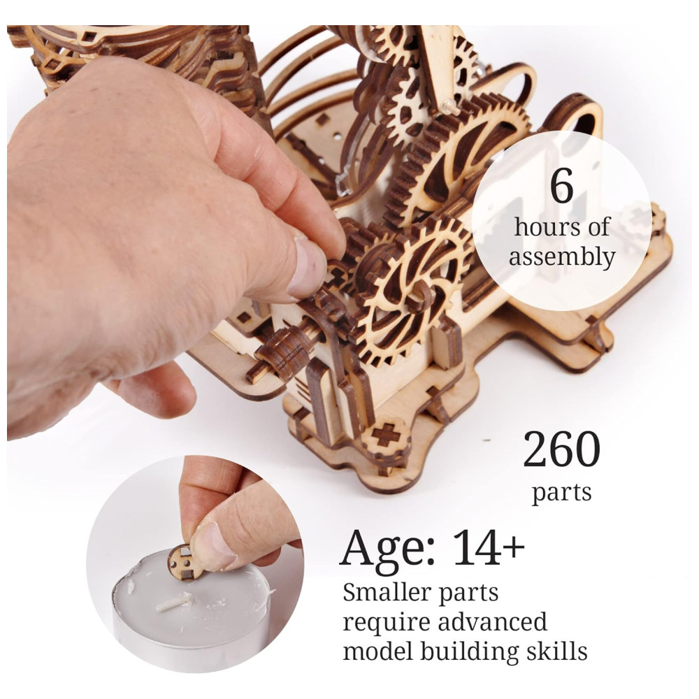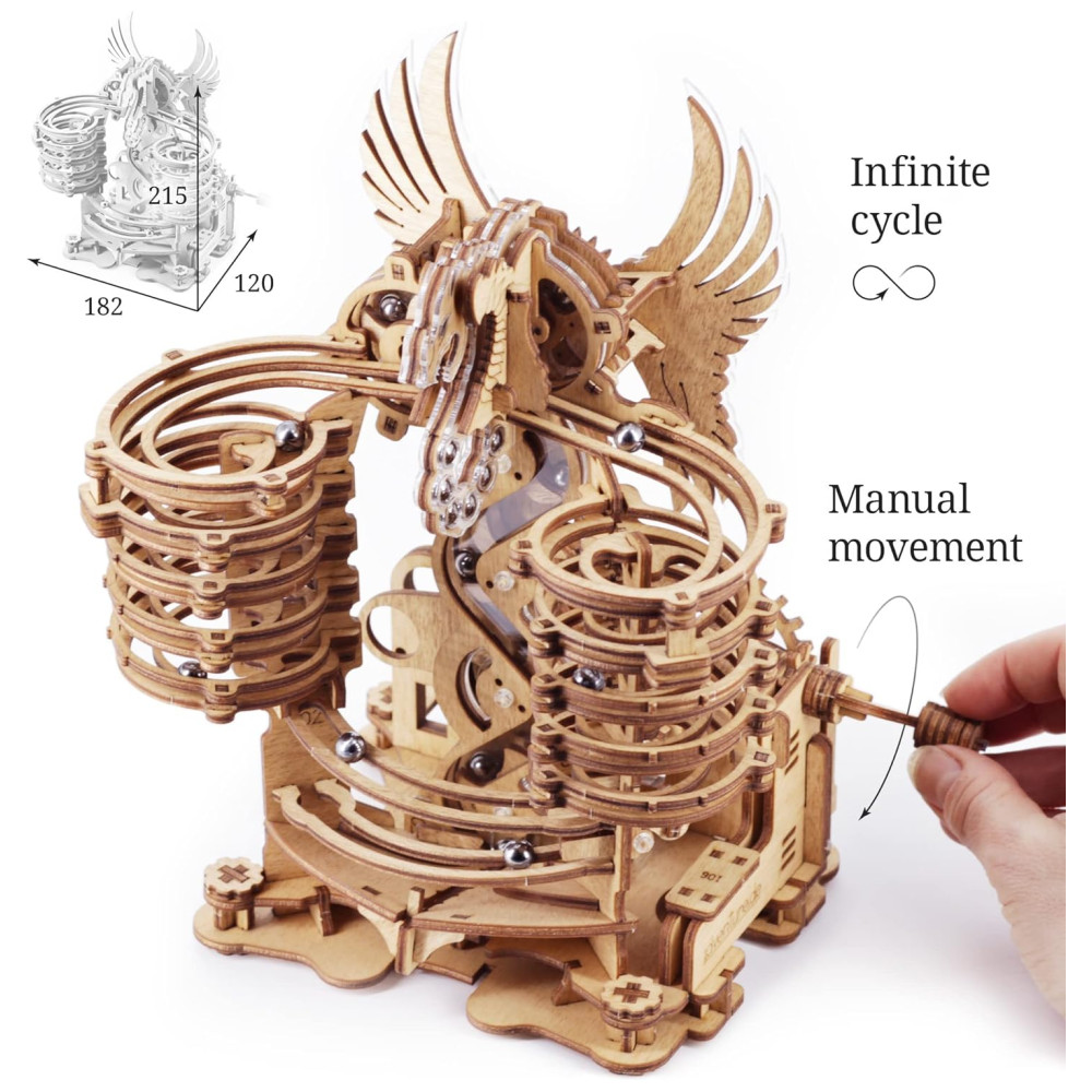O iDventure Marble Run Dragon é um kit de quebra cabeça de madeira para adultos e adolescentes, composto por 260 componentes e 15 bolinhas de gude. Com este kit, você pode construir sua própria pista de mármore mecânica em cerca de 4 horas, sem a necessidade de ferramentas ou adesivos. As bolinhas de gude são transportadas automaticamente para o topo e podem ser trocadas para duas pistas diferentes com uma chave seletora. O conjunto também inclui uma manivela que coloca a pista em movimento. Além de ser uma atividade artesanal emocionante, a construção da pista de mármore também ajuda a melhorar a concentração e a reduzir o estresse. O kit é feito de madeira cultivada de forma sustentável. É uma ótima ideia de presente para amantes de quebra cabeças e amadores.