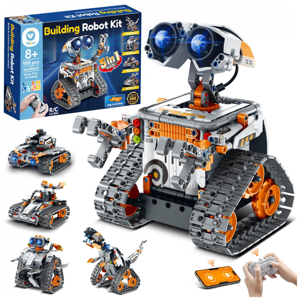 O kit de robótica Sillbird 5 em 1 é um conjunto de construção com 488 peças que permite montar diferentes modelos de robô e veículos com controle remoto e controle via aplicativo. Voltado para crianças a partir de 8 anos, integra montagem tipo blocos, eletrônica básica e recursos de programação simples, apoiando introdução estruturada à robótica educacional. O sistema oferece controle por rádio e por app, com modos como direção por trajetória, controle por giroscópio, direção com uma mão e programação básica.