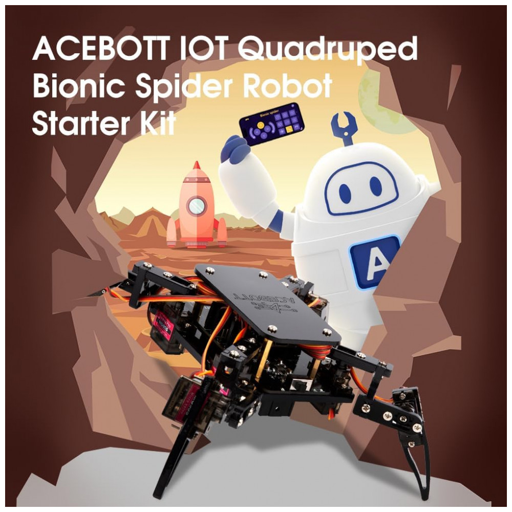 O ACEBOTT Spider Robot Building Kit QD020 é um kit educativo de robótica que utiliza uma placa baseada em ESP8266 e servos MG90 com engrenagens metálicas para montar um robô aranha articulado com movimentos de rastejo. O conjunto inclui estrutura mecânica, parafusos padronizados e eletrônica dedicada, com 6 modos de movimento e 9 ações pré‑configuradas que podem ser controladas por aplicativo, oferecendo uma experiência prática de programação e controle de robôs. O robô possui recarga direta via USB‑C e utiliza uma bateria recarregável do tipo 18650 (não incluída), o que amplia o tempo de uso contínuo em atividades de aula ou projetos em casa.