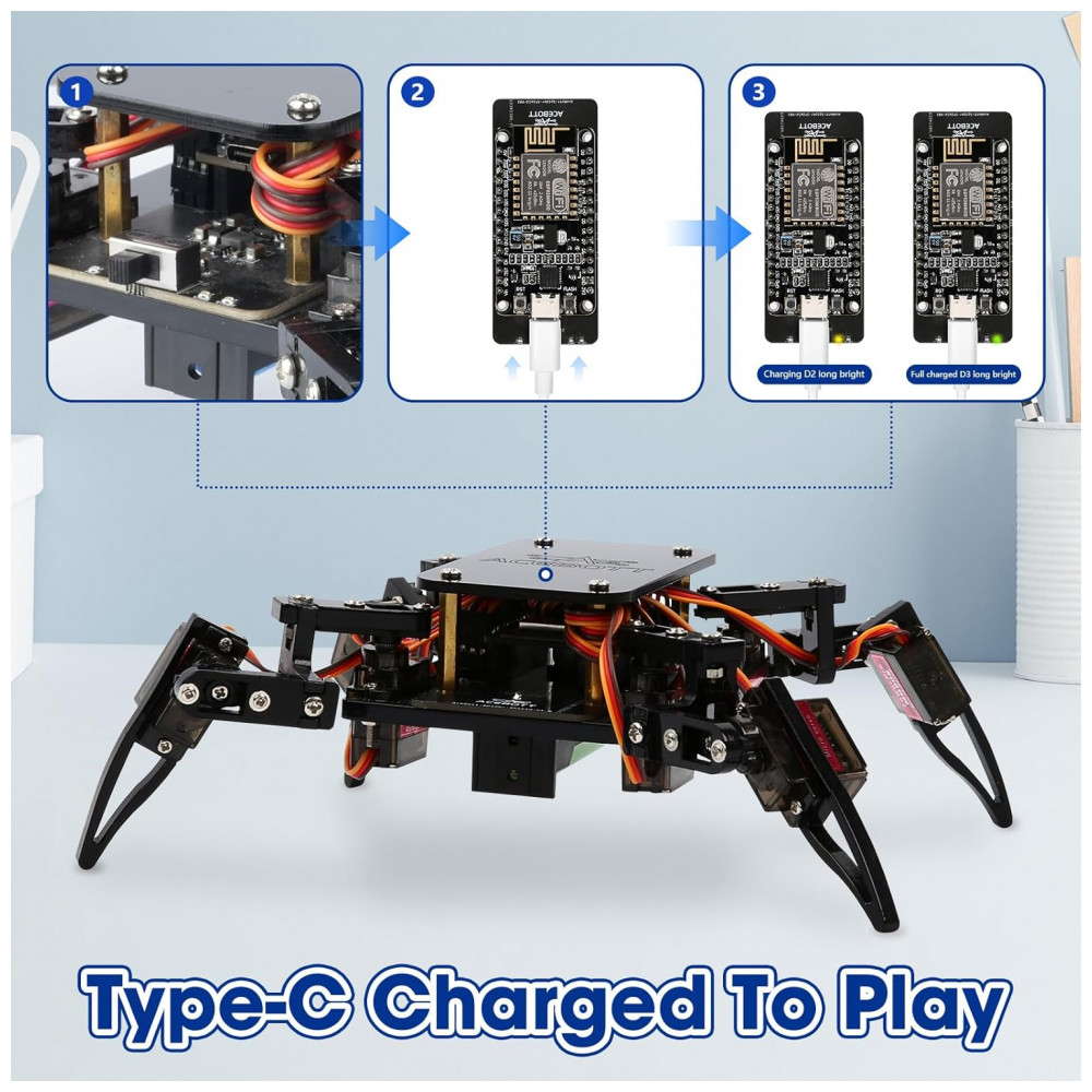Kit robô aranha ACEBOTT QD020 com ESP8266 servos MG90 controle por app via USB‑C para montagem e programação STEM