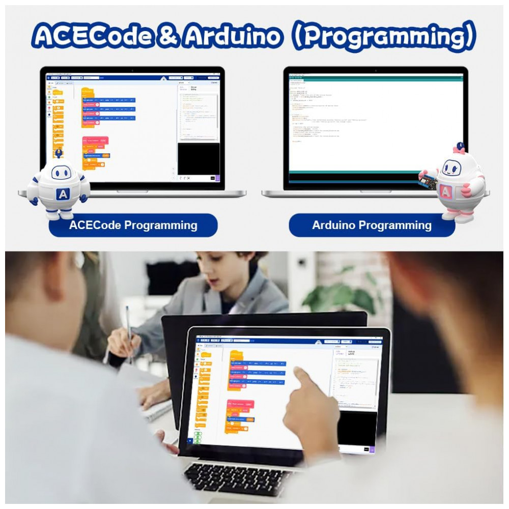 Linguagens de programação suportadas: Arduino IDE (C/C++ simplificado) e ACECode/Scratch (blocos)