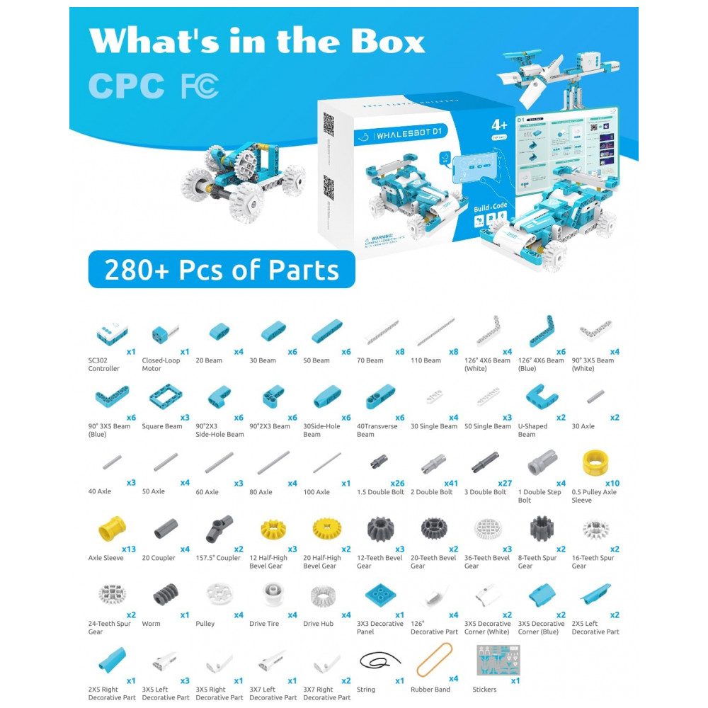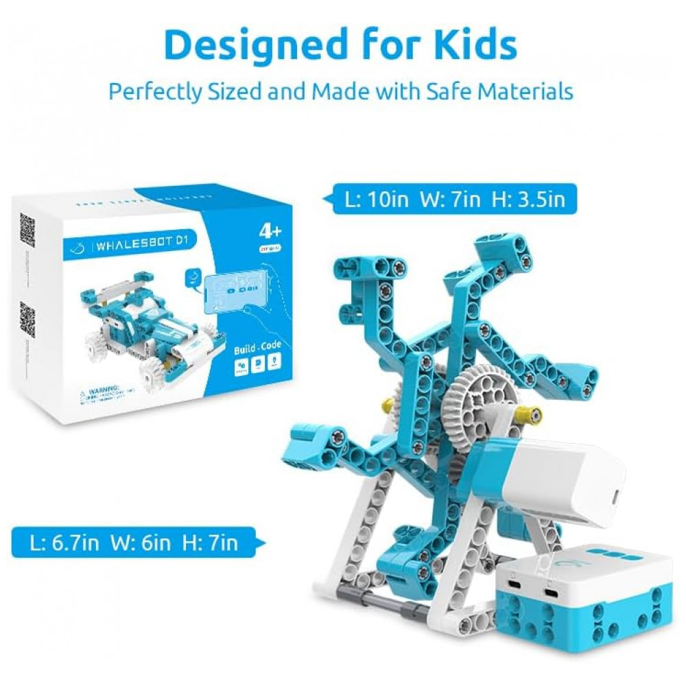 O kit de robótica WhalesBot D1 é um conjunto de construção STEM projetado para introduzir crianças a partir de 4 anos aos conceitos de programação, lógica e montagem de robôs. Ele combina blocos de construção, controle remoto via aplicativo e codificação modular em um único sistema, permitindo criar diferentes modelos com a mesma base eletrônica. Com mais de 280 peças e um controlador com motor inteligente, o conjunto possibilita montar até 21 modelos de robôs, variando em forma, mobilidade e funções interativas.