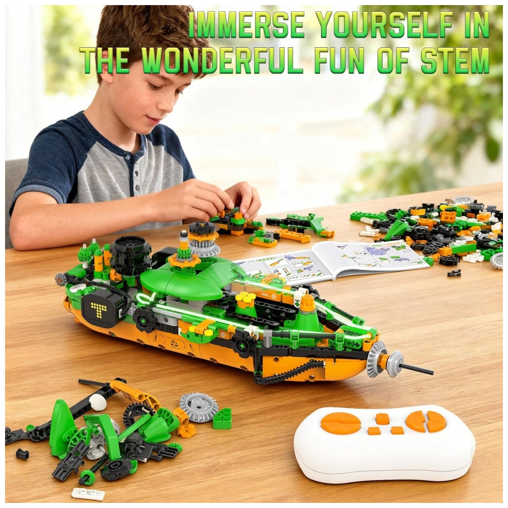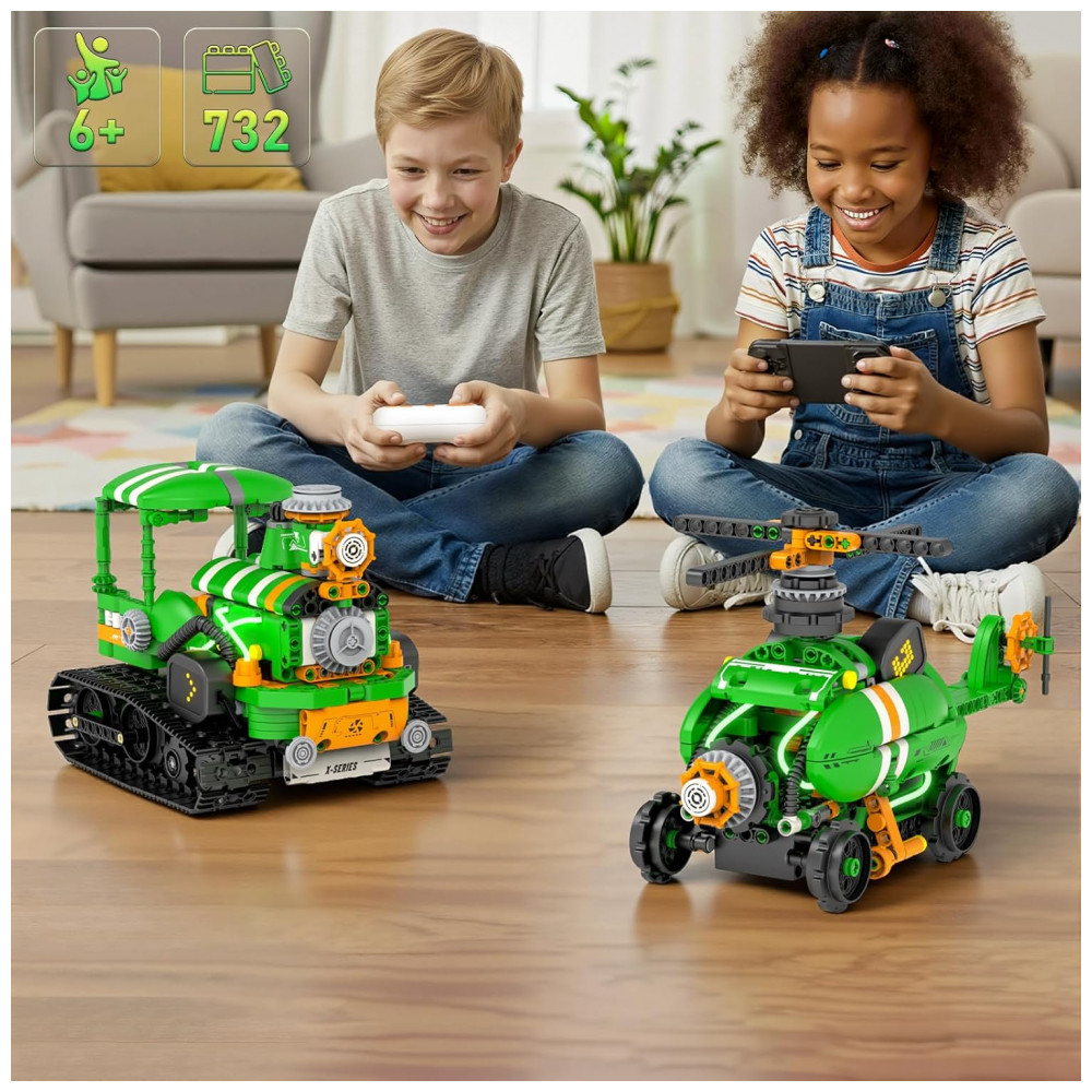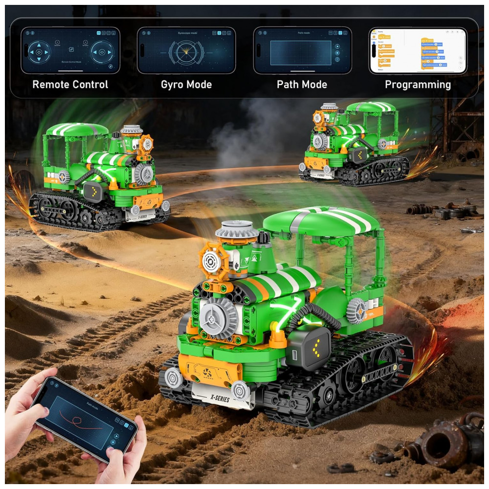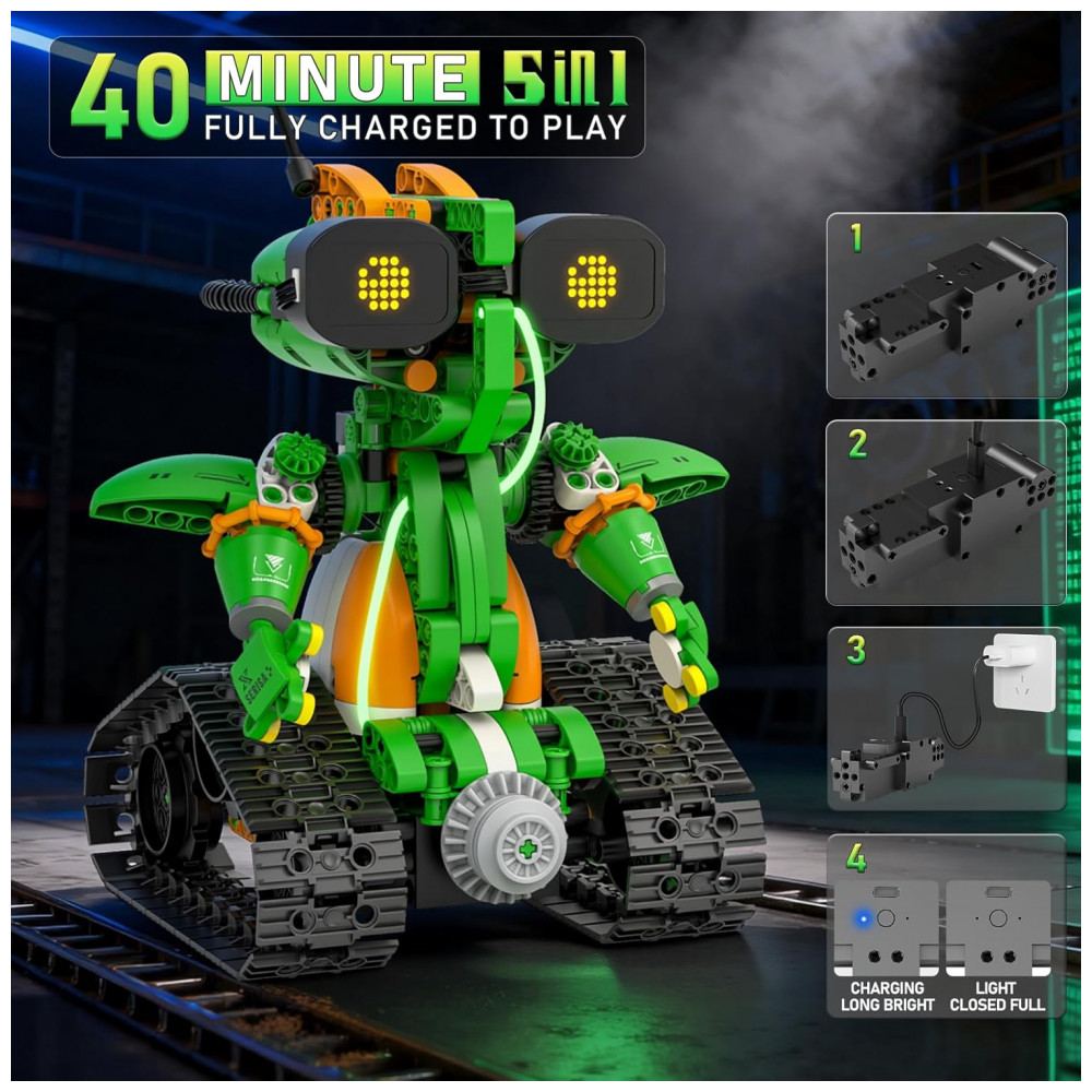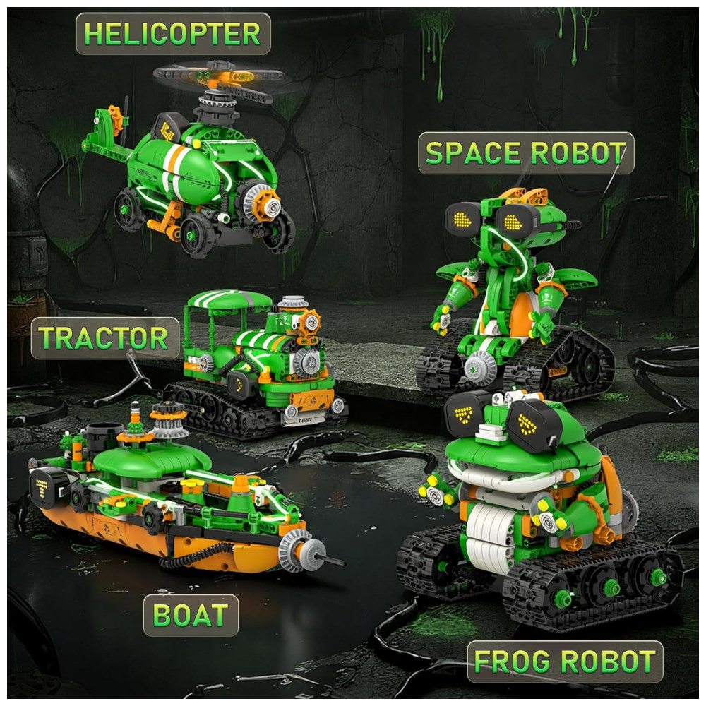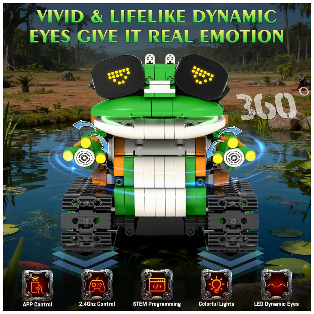 O kit de robótica QHECTTY 5 em 1 é um conjunto de construção com 732 peças que permite montar cinco modelos diferentes: sapo robótico realista, robô criatura alienígena, trator pesado, helicóptero e barco criativo. Os modelos utilizam blocos compatíveis com outras marcas, módulo motorizado e unidade de controle, oferecendo experiência de montagem detalhada com foco em engenharia e robótica básica. O sistema conta com olhos em LED animados que mudam de expressão conforme os comandos do controle remoto, além de iluminação complementar para tornar a interação mais visual.