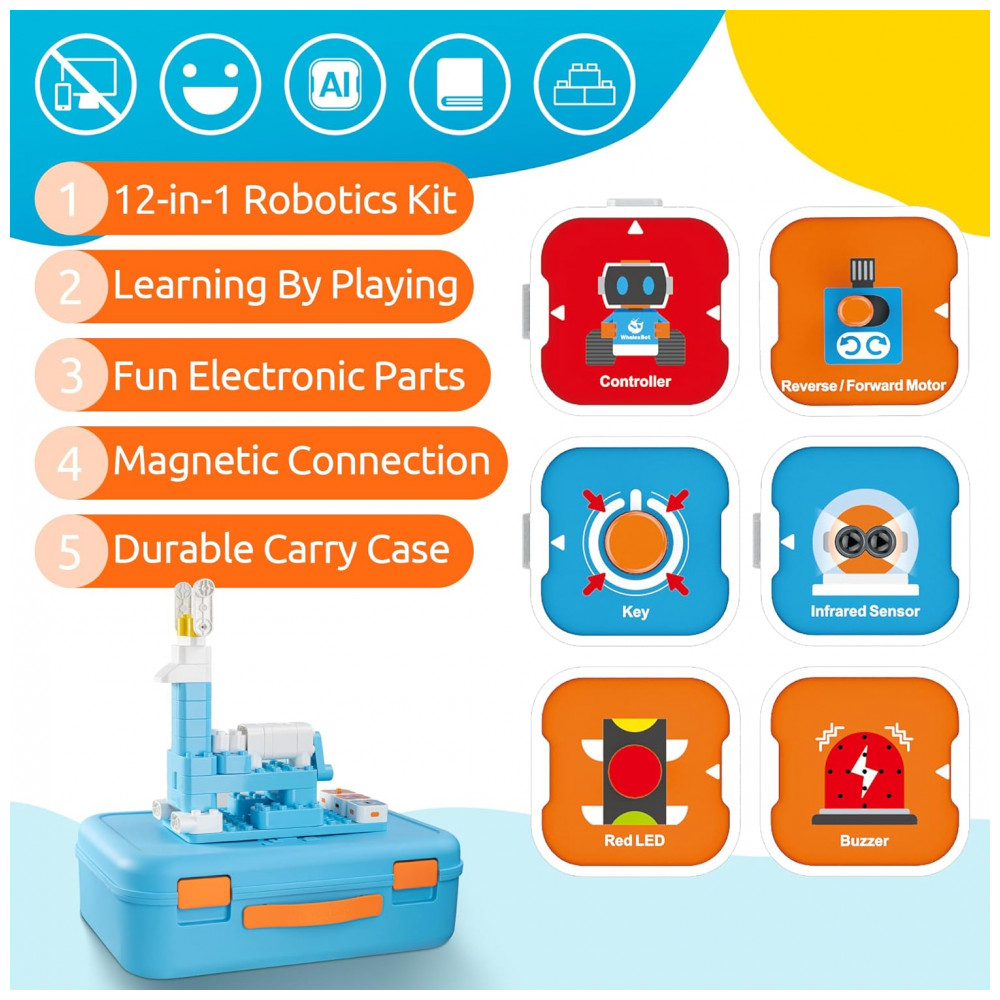 Kit Robôs de Programação STEM WhalesBot A3 e E7 Pro com Blocos Magnéticos e Programação em Scratch para Crianças de 3 a 12 Anos