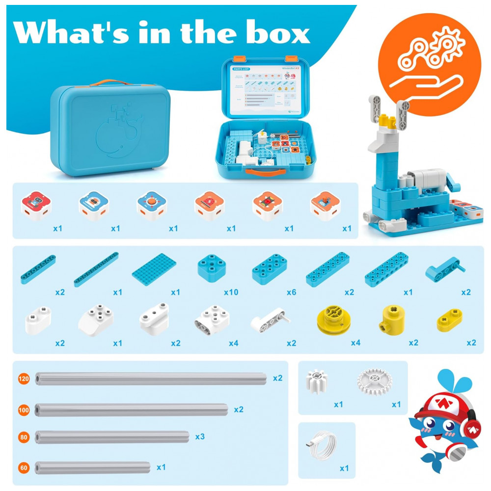 O conjunto WhalesBot A3 e E7 Pro reúne dois kits de robótica educativa que cobrem desde a introdução à programação física sem tela até a programação visual em Scratch com projetos mais complexos. O A3 utiliza blocos magnéticos com controlador, sensores e atuadores em peças grandes e arredondadas, adequadas para crianças pequenas, permitindo criar diferentes modelos e controlar respostas simples a sensores. Já o E7 Pro é um kit 12 em 1 com controlador baseado em processador ARM Cortex M3, múltiplas interfaces para sensores e atuadores e mais de 600 peças de construção, voltado a crianças maiores que programam os modelos em Scratch, Python ou C.