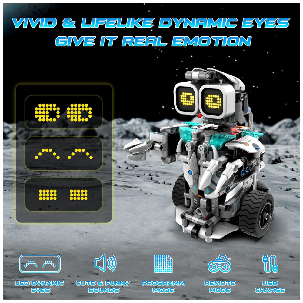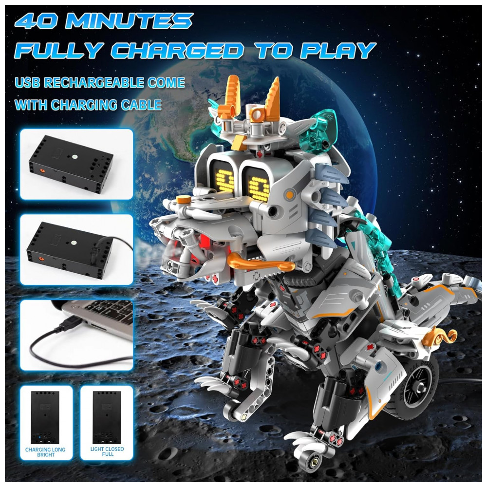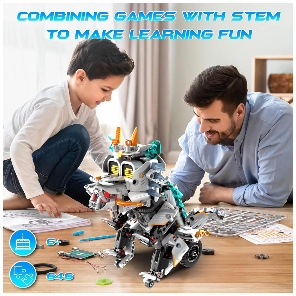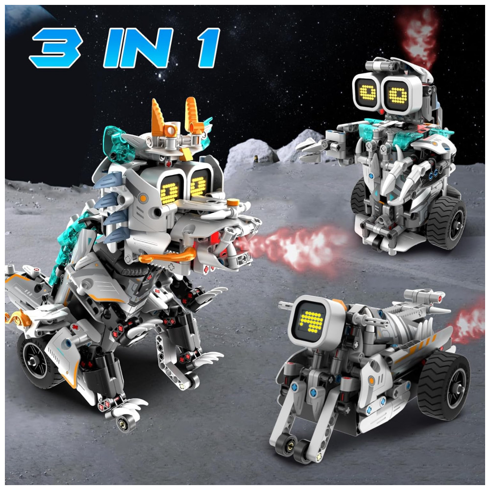 O Kit Robótico QHECTTY RC STEM 3 em 1 dinossauro e moto é um conjunto de construção com 646 peças que permite montar três modelos motorizados diferentes: dragão que “cospe fogo”, robô meca com aparência de criatura alienígena e moto-foguete acrobática com rotação de 360°. O módulo frontal utiliza olhos em LED com animações dinâmicas e o sistema de spray luminoso colorido simula jatos de névoa iluminada, acompanhado de efeitos sonoros durante a movimentação. As peças são produzidas em plástico atóxico com encaixes firmes, e o kit inclui controle remoto 2,4G e aplicativo com interface baseada em ícones para controlar direção, rota, rotação e funções especiais dos modelos. A aplicação oferece modos de direção direta, controle por gravidade, modo de percurso e modo de programação STEM, permitindo que iniciantes em codificação criem sequências de comandos de forma visual e intuitiva.