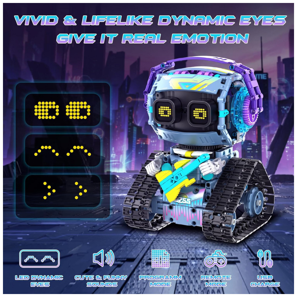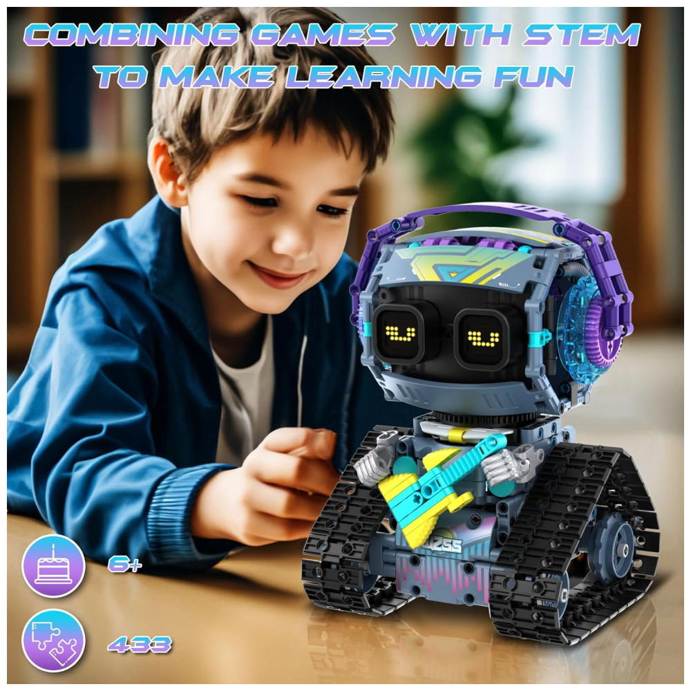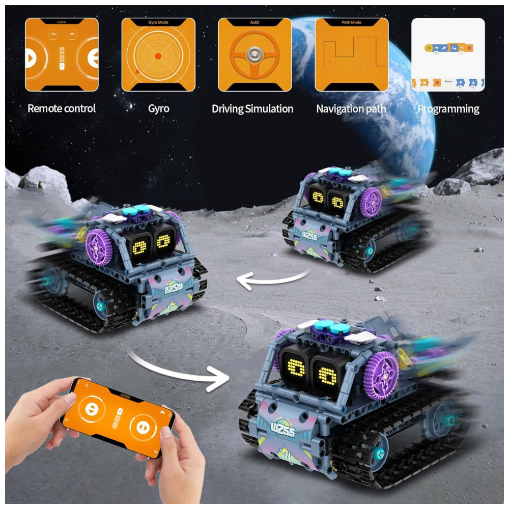 O Kit Robótico QHECTTY RC STEM 3 em 1 é um conjunto de construção com 433 peças que permite montar três modelos diferentes: robô guitarrista, caminhão basculante acrobático com rotação de 360° e robô rolo compressor para “pavimentação” de pistas imaginárias. O módulo frontal conta com olhos em LED dinâmicos, que mudam de expressão conforme os comandos do controle, além de efeitos sonoros que acompanham os movimentos dos modelos. As peças em plástico atóxico formam estruturas robustas, e o sistema de tração motorizado é controlado por controle remoto 2,4G ou por aplicativo com interface baseada em ícones, que permite operar direção, giro, rota e manobras especiais. O aplicativo inclui modos de direção direta, controle por gravidade, percurso e programação STEM, oferecendo diferentes formas de interação para iniciantes em codificação.