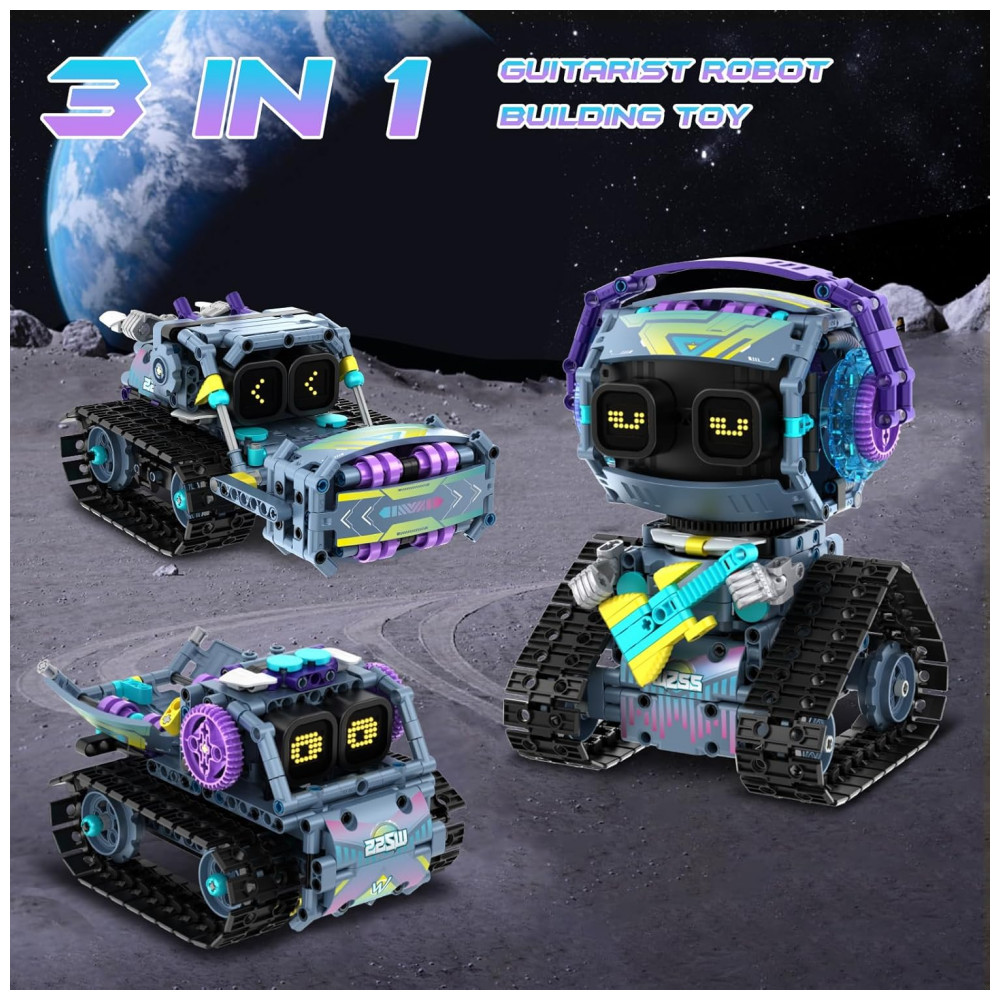 Indicado para crianças a partir de 6 anos, o kit envolve peças pequenas, etapas de montagem sequenciais e componentes eletrônicos, o que exige coordenação motora fina, atenção e capacidade de seguir instruções ilustradas. A combinação de robô guitarrista, caminhão acrobático e rolo compressor, junto com os modos de controle remoto e aplicativo, torna o conjunto adequado para crianças em idade escolar interessadas em robótica e veículos de engenharia.