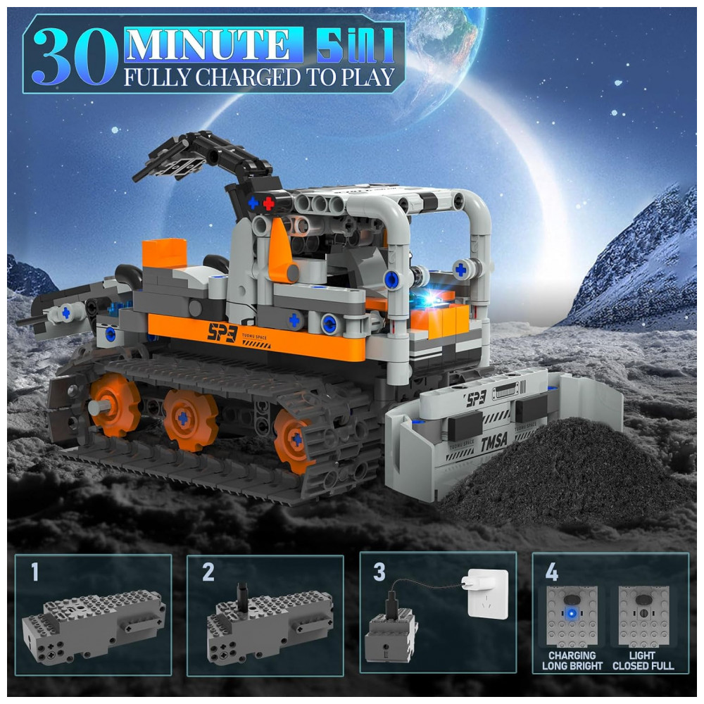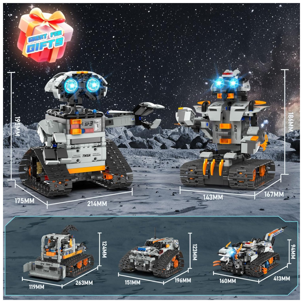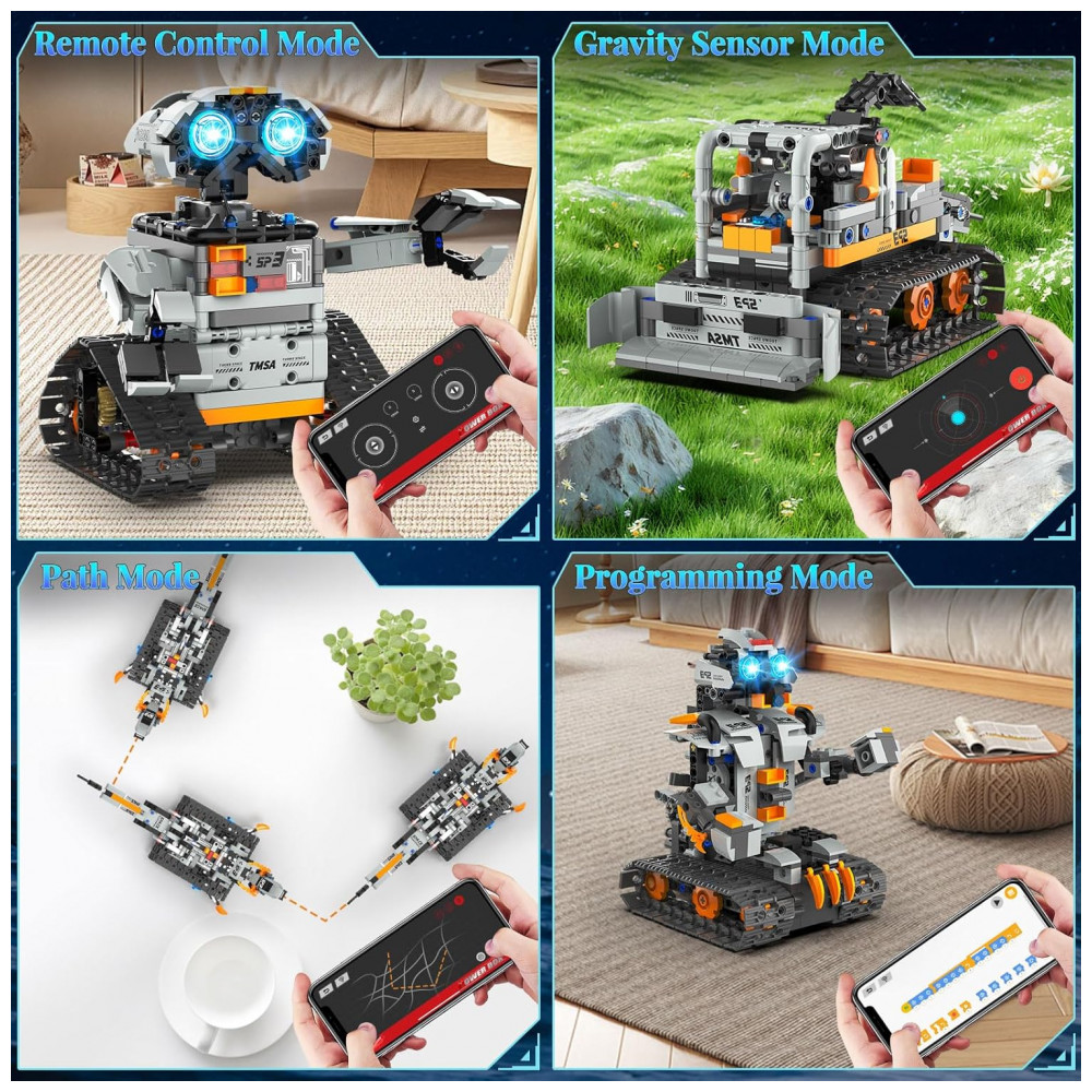 O Kit Robótico QHECTTY RC STEM 5 em 1 é um conjunto de construção com 688 peças que permite montar cinco modelos: robô de parede para exploração espacial, trator de esteiras tipo bulldozer de construção pesada, carro de corrida sobre esteiras para terrenos acidentados, robô boxeador de grande porte e dinossauro mecânico de temática espacial. O sistema utiliza módulo de tração com dois motores de alta velocidade e bateria recarregável de 3,7V 500mAh, oferecendo potência para manobras em pisos lisos e superfícies mais irregulares. O controle pode ser feito por controle remoto 2,4G ou por aplicativo, que apresenta interface por ícones e modos de direção direta, controle por gravidade, percurso e programação STEM. As peças são produzidas em plástico atóxico, compatíveis com a maioria dos blocos de construção semelhantes, e o kit inclui manual colorido passo a passo para facilitar a montagem de cada modelo.