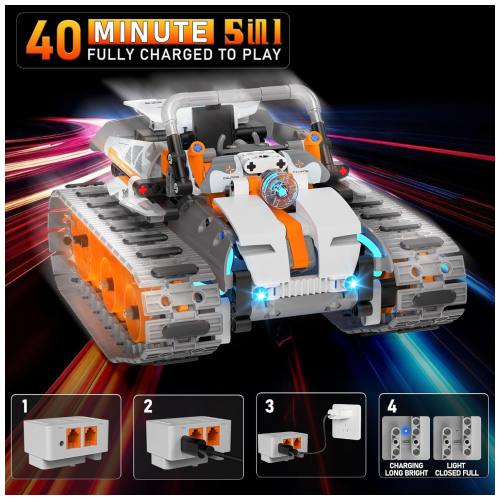 O Kit Robótico QHECTTY RC STEM 5 em 1 é um conjunto de construção com 552 peças que permite montar cinco modelos motorizados: tanque pesado de grande potência, robô meca armado, carro acrobático com rolagem em 360°, bulldozer de construção e veículo de esteiras para todos os terrenos com visual de tecnologia espacial. O sistema utiliza módulo de tração com dois motores de alta velocidade e bateria recarregável de 7,4V 300mAh, fornecendo força para deslocamento em pisos lisos e superfícies mais irregulares. Todas as peças são produzidas em plástico atóxico, com encaixes firmes e certificações ASTM e CPSIA, e o kit inclui dois manuais coloridos passo a passo para orientar a montagem dos modelos. O conjunto conta ainda com módulo de iluminação colorida e controle por remoto 2,4G ou aplicativo com interface por ícones, que oferece modos de direção, percurso, gravidade e programação STEM.