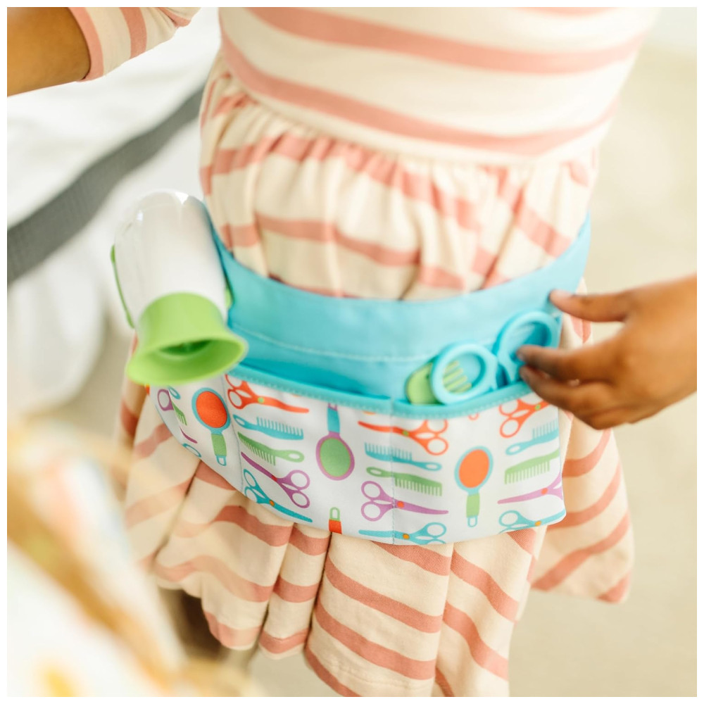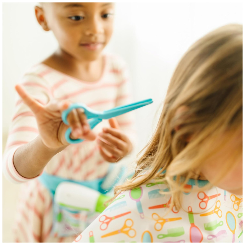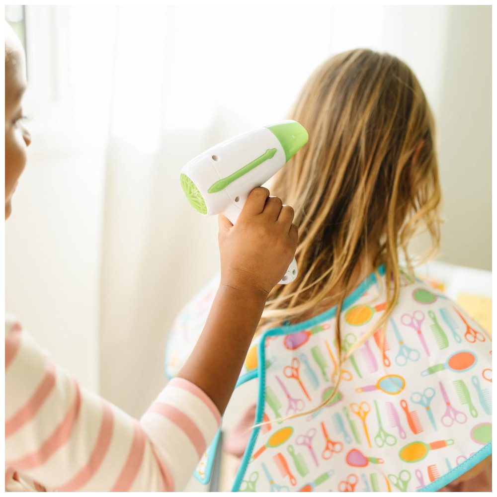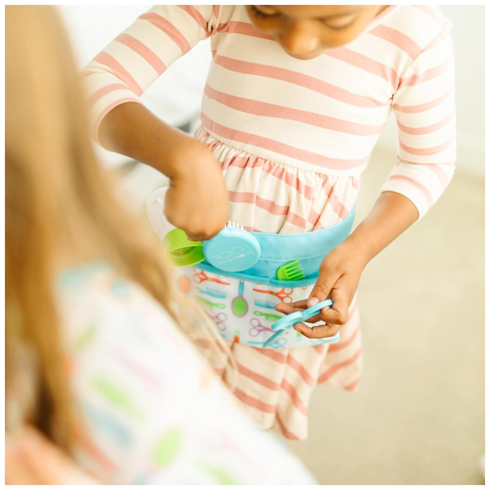Este conjunto de 16 peças é perfeito para crianças que adoram brincar de spa e salão de beleza Com um avental e uma capa protetora, os pequenos estilistas podem fingir que lavam, cortam e penteiam o cabelo dos clientes usando acessórios como tesoura, escova, pente e um secador de cabelo que sopra ar de verdade.