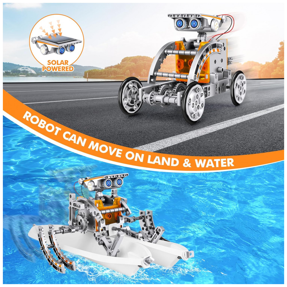 O kit STEM 13‑in‑1 Education Solar Power Robots é um conjunto de robótica de montar que permite às crianças construir até 13 tipos diferentes de robôs movidos a energia solar, usando engrenagens, placas, pneus e eixos para criar modelos que se deslocam em terra ou na água. A proposta é que o próprio pequeno engenheiro siga o manual passo a passo, monte, desmonte e reconstrua os projetos, explorando como cada combinação de peças altera o movimento e o comportamento do robô.