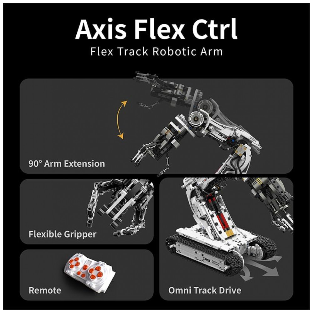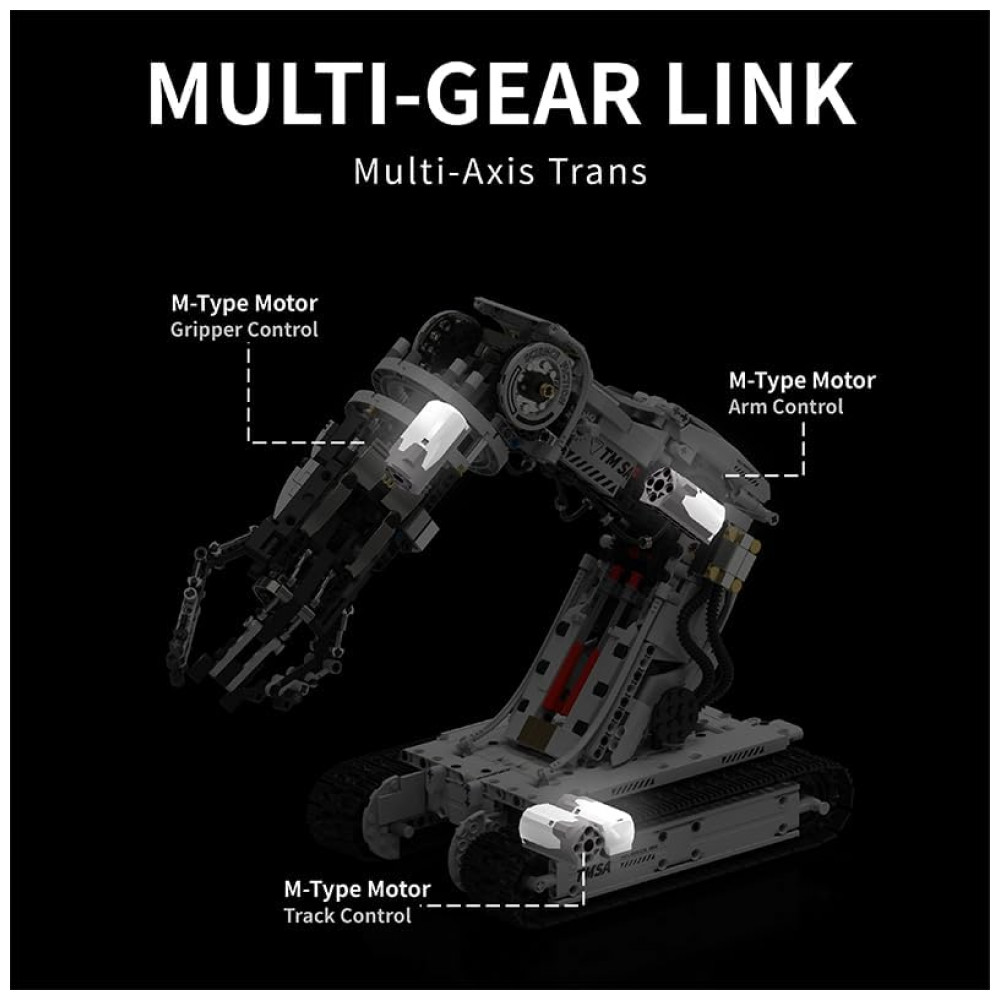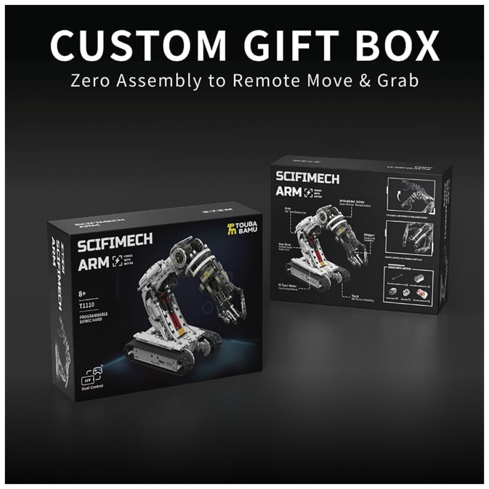 O kit Technical Tracked Robot Arm da UNCLE BRICK é um conjunto de blocos de montar com 1468 peças que permite construir um braço robótico motorizado sobre esteiras, com funções completas de locomoção e preensão. O modelo utiliza uma base tipo tanque com esteiras para movimentação para frente, para trás, giros em U e rotações laterais, além de um braço articulado que gira até 90 graus e uma garra que abre e fecha mais de 180 graus. O sistema é alimentado por caixa de bateria de íons de lítio e controlado por quatro motores M, com operação via controle remoto e também por aplicativo, tornando o modelo adequado tanto para exibição quanto para uso diário em brincadeiras de controle.