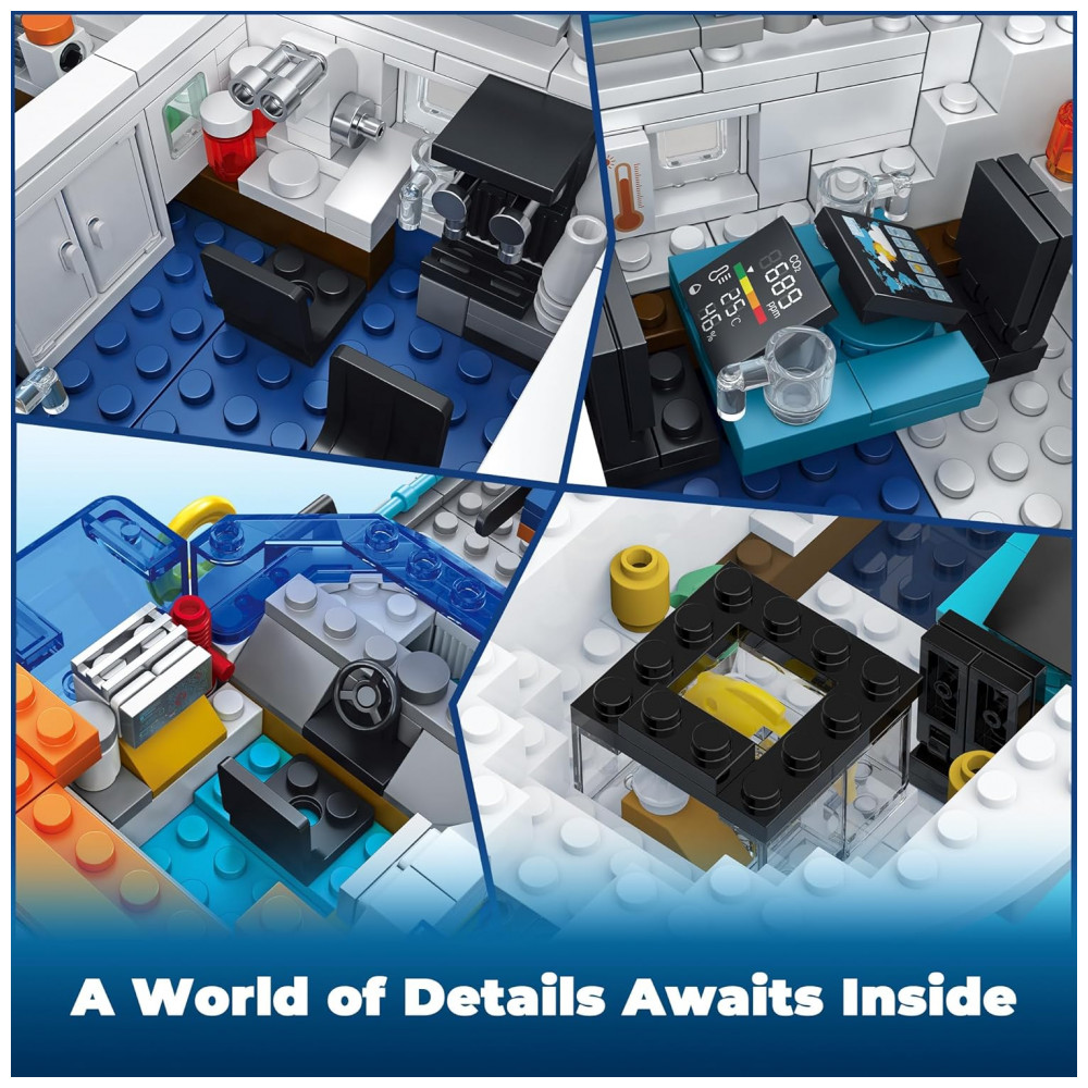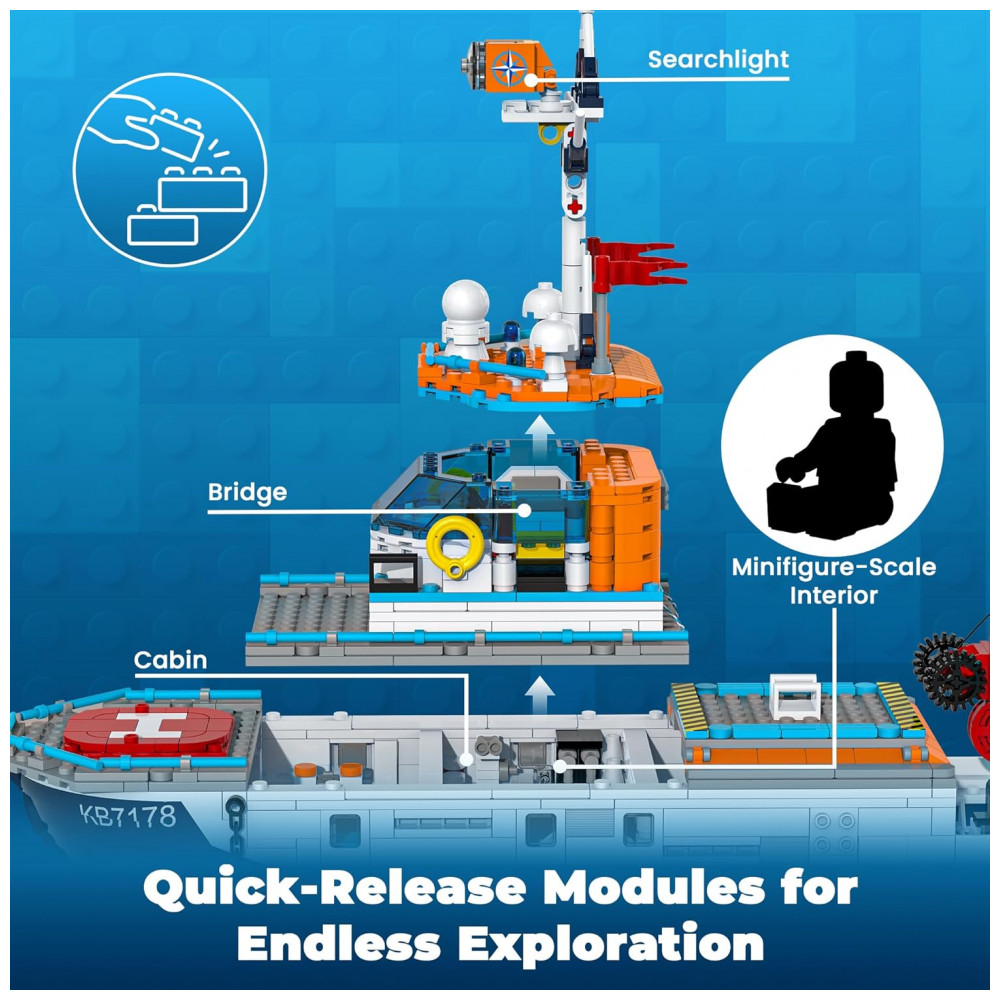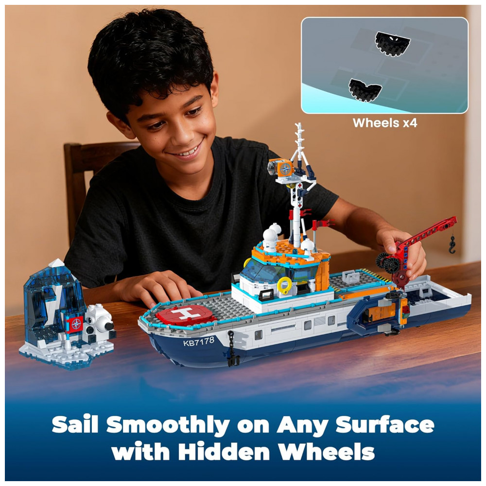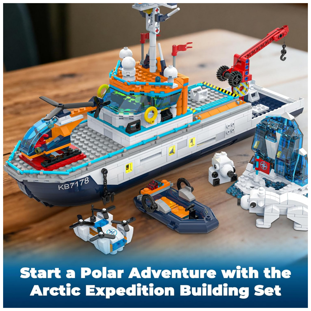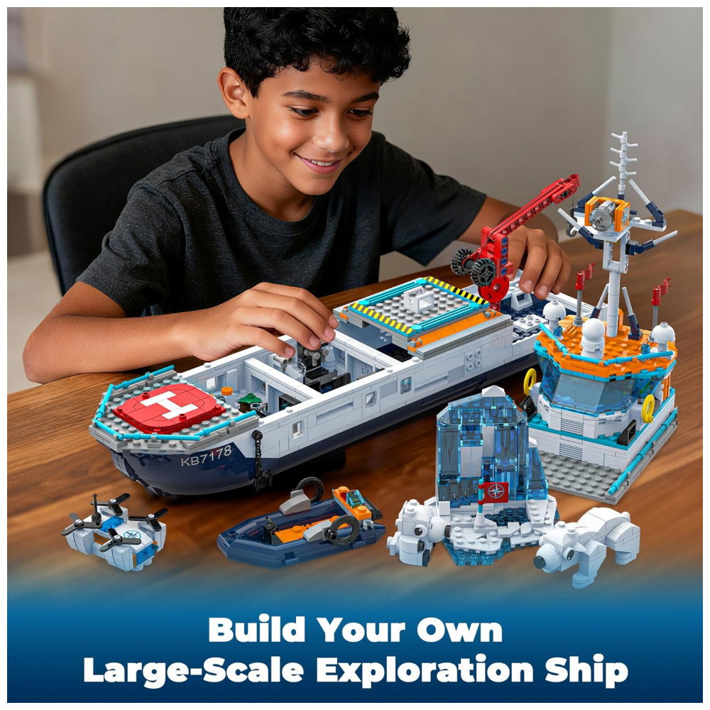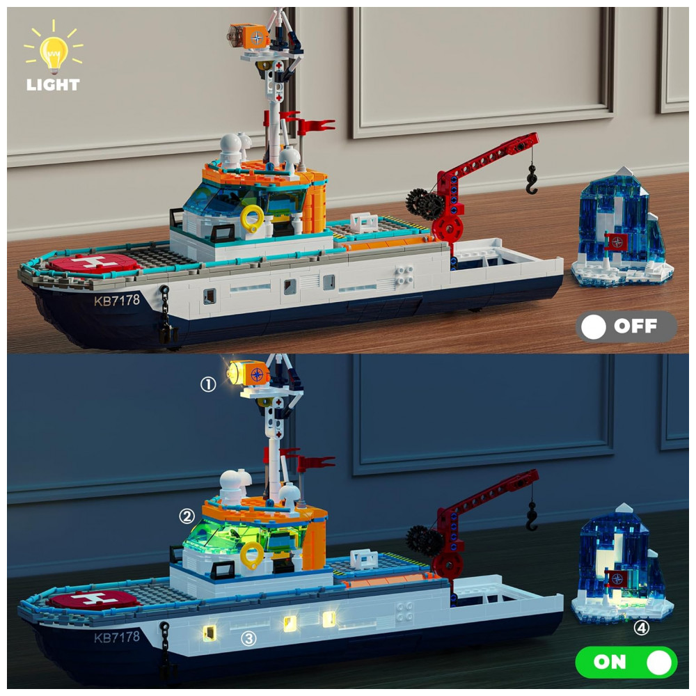 O Kit Navio Polar Glikid City Boat é um conjunto de construção que reproduz um navio quebra-gelo de exploração ártica com sistema de iluminação em LED na torre de sinalização, ponte de comando, cabines e na base do iceberg. A estrutura do navio inclui guindaste com engrenagem e gancho com roldana para içar e baixar o submersível, além de teto da cabine e convés superior com abertura rápida para acesso aos compartimentos internos. O cenário é complementado por helicóptero, drone, barco rápido, bote salva-vidas, submersível, iceberg montável e dois ursos polares, permitindo criar missões de pesquisa, resgate e observação em ambiente gelado. As peças são produzidas em plástico atóxico com bom nível de detalhe, e o kit inclui manual ilustrado por etapas, com sacos numerados para facilitar a montagem por crianças e iniciantes.