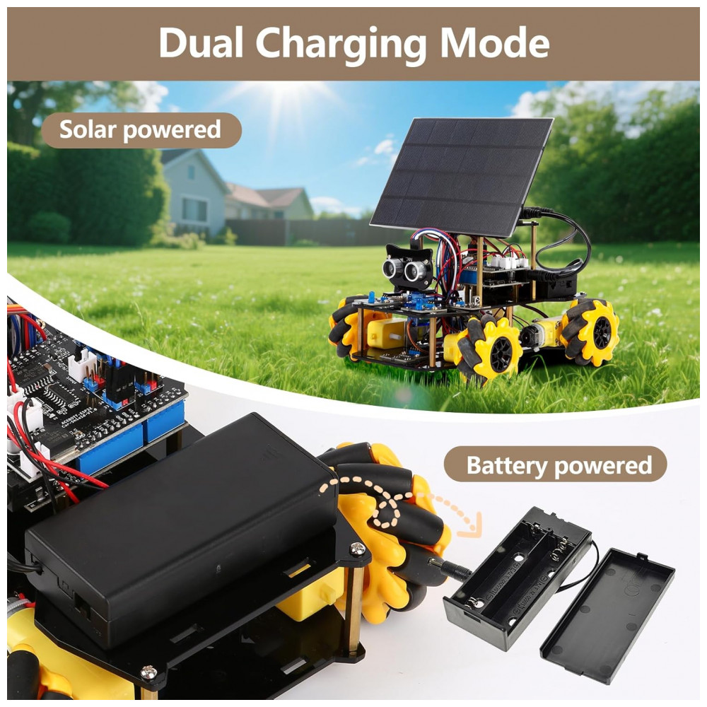 O kit ACEBOTT STEM Robot Car com energia solar é um conjunto educativo de robótica projetado para montagem de um carro 4WD com controlador ESP32 programável e rodas mecanum, permitindo movimentos em múltiplas direções. O sistema é compatível com Arduino IDE e Scratch, possibilitando atividades de programação em blocos e em código, com 16 tutoriais introdutórios que orientam desde a montagem até a criação de rotinas de movimento e navegação. O painel solar de alta eficiência converte luz em energia elétrica, oferecendo uma experiência prática de uso de energia renovável em um robô móvel.
