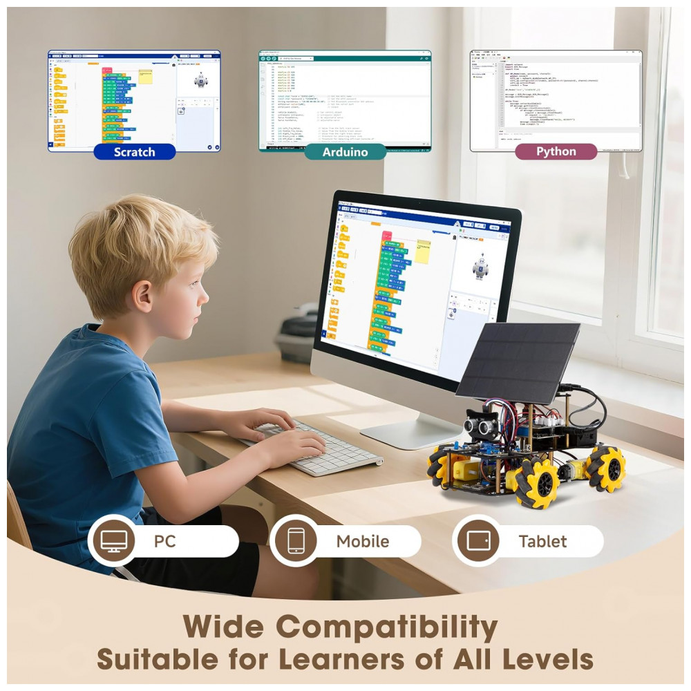 Durante o uso, a criança desenvolve raciocínio lógico, pensamento sequencial, coordenação motora fina e capacidade de solucionar problemas ao testar, corrigir e otimizar o código do robô. O kit também estimula compreensão de conceitos de eletrônica simples, funcionamento de motores com tração 4WD, uso de painel solar e alternância entre diferentes fontes de alimentação.