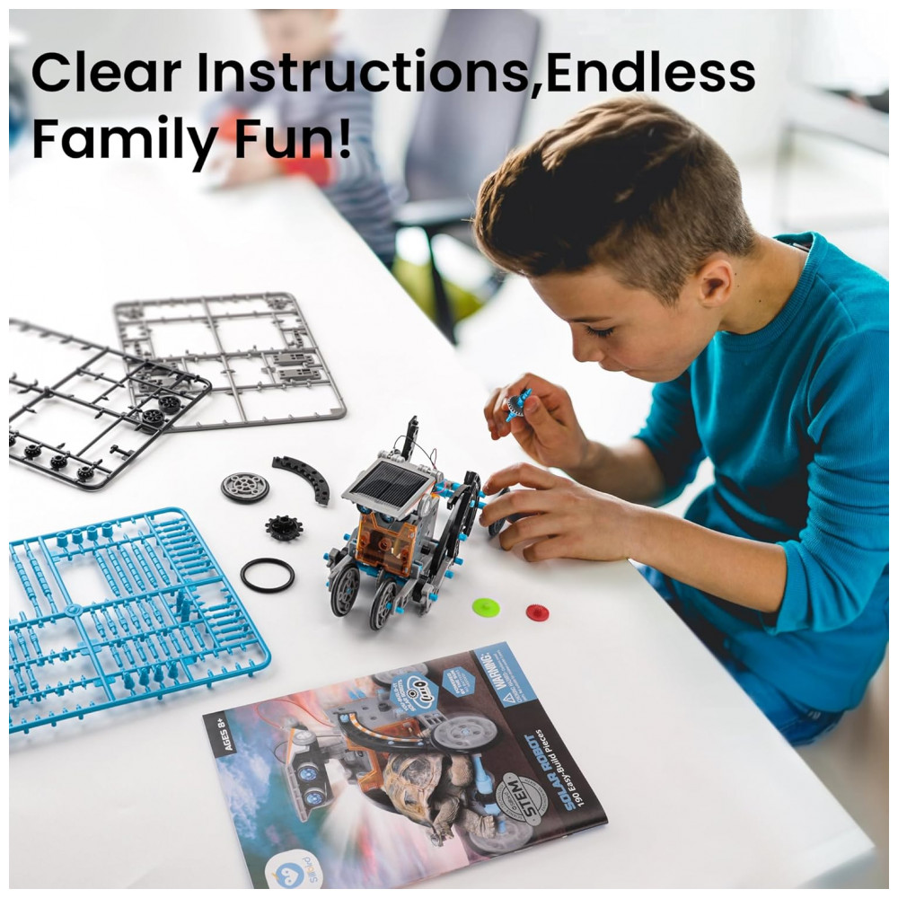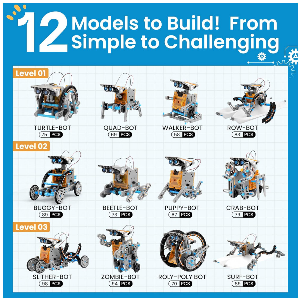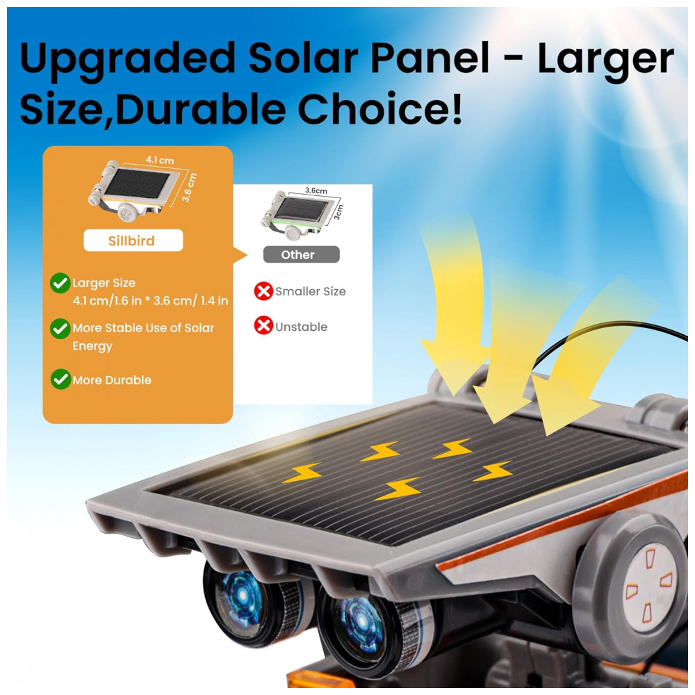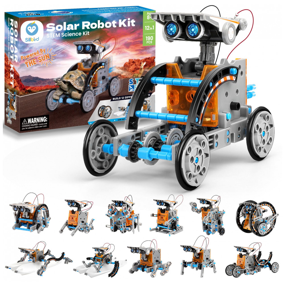 O kit Sillbird STEM 12‑in‑1 é um conjunto de robô solar de montar com 190 peças que permite construir 12 modelos diferentes de robôs e veículos, com opções que se movem em terra ou em água conforme o projeto selecionado. As peças incluem engrenagens, eixos, rodas, flutuadores e elementos estruturais plásticos, organizados para montagens de nível iniciante e avançado utilizando o mesmo conjunto em diferentes configurações. O sistema é alimentado exclusivamente por um painel solar, que converte luz em energia elétrica para acionar o motor e o trem de engrenagens, dispensando o uso de pilhas.