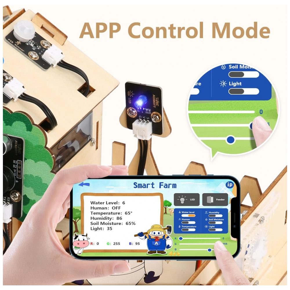 O kit ACEBOTT ESP32 Smart Farm é um conjunto STEM para adolescentes e adultos que permite construir uma estufa IoT funcional, com sistemas de irrigação automática, alimentador de pets, moinho solar e iluminação RGB controlada. Baseado em uma placa ESP32 com Wi‑Fi e Bluetooth, o kit integra sensores de umidade do solo, nível de água, luz, temperatura, além de módulos de bomba, motor e tira RGB para simular processos de agricultura moderna, sustentabilidade e automação residencial em uma maquete de fazenda inteligente em madeira.