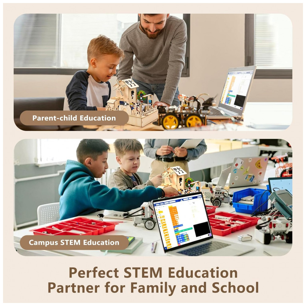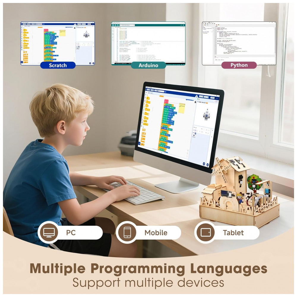 Os 16 tutoriais em formato de histórias utilizam programação em blocos (Scratch/ACECode) e Arduino IDE, guiando o aluno desde projetos básicos até aplicações mais completas de monitoramento e controle remoto. As peças em madeira compensada ecológica são cortadas a laser e montadas sem solda, permitindo personalização com pintura e decoração, enquanto a parte eletrônica usa conectores Easy‑Plug para reduzir erros de ligação e facilitar o uso em casa ou em sala de aula.