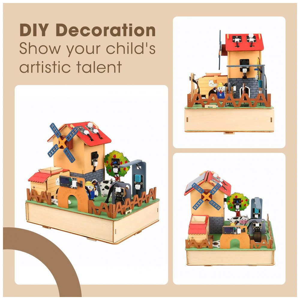 Sensores e módulos (principais): Sensor de umidade do solo, sensor de luz, sensor de nível de água, sensor de temperatura/umidade ambiente, módulo de bomba d’água, motor DC para moinho, tira de LED RGB, painel solar, relé e buzzer (conforme versão do kit)