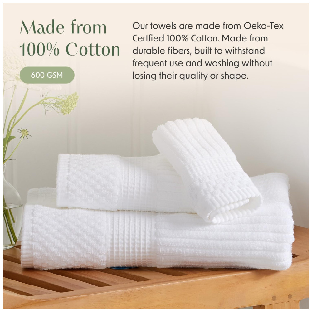 Este conjunto de toalhas de banho é composto por 4 peças, cada uma medindo 132 x 76 cm. Confeccionadas em 100% algodão de alta qualidade, elas oferecem máximo conforto e durabilidade. Com uma gramatura de 600 GSM, essas toalhas proporcionam absorção extra e secagem rápida, graças ao seu tecido texturizado.