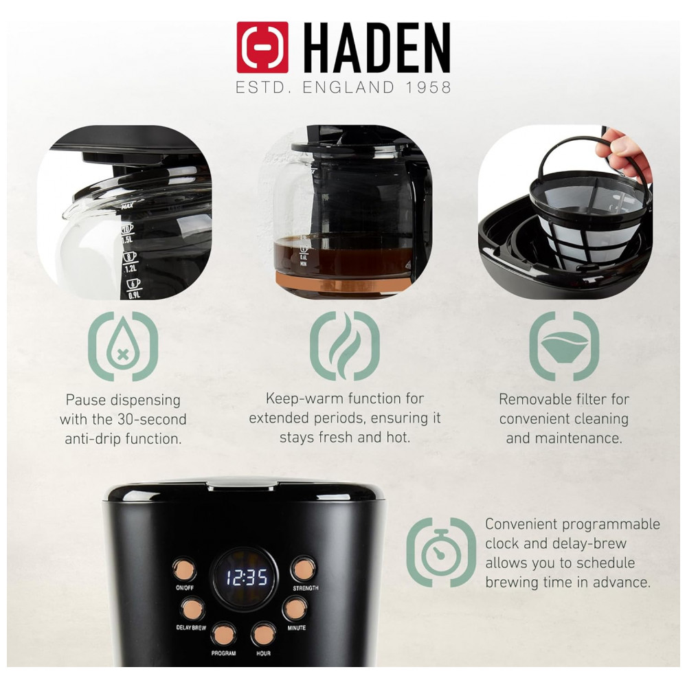 O kit Haden Dorset une a Torradeira Elétrica 4 Fatias com slots largos e a Cafeteira Elétrica Programável 12 xícaras, ambos em aço inoxidável com acabamento preto e cobre, projetados para máxima eficiência, precisão e durabilidade em ambientes residenciais. A torradeira possui quatro câmaras independentes com largos slots auto-centralizadores, ideais para diversos tipos de pães (bagels, fatias grossas, waffles) e função de centragem automática para distribuição uniforme do calor, assegurando torra homogênea. O controle variável de temperatura permite selecionar o grau de tostagem, com funções dedicadas para descongelamento e bagel, além de botão cancelar para interrupção instantânea do ciclo. A estrutura interna pintada em aço inoxidável aumenta a resistência térmica e facilita a higienização, complementada por bandejas coletoras de migalhas removíveis.