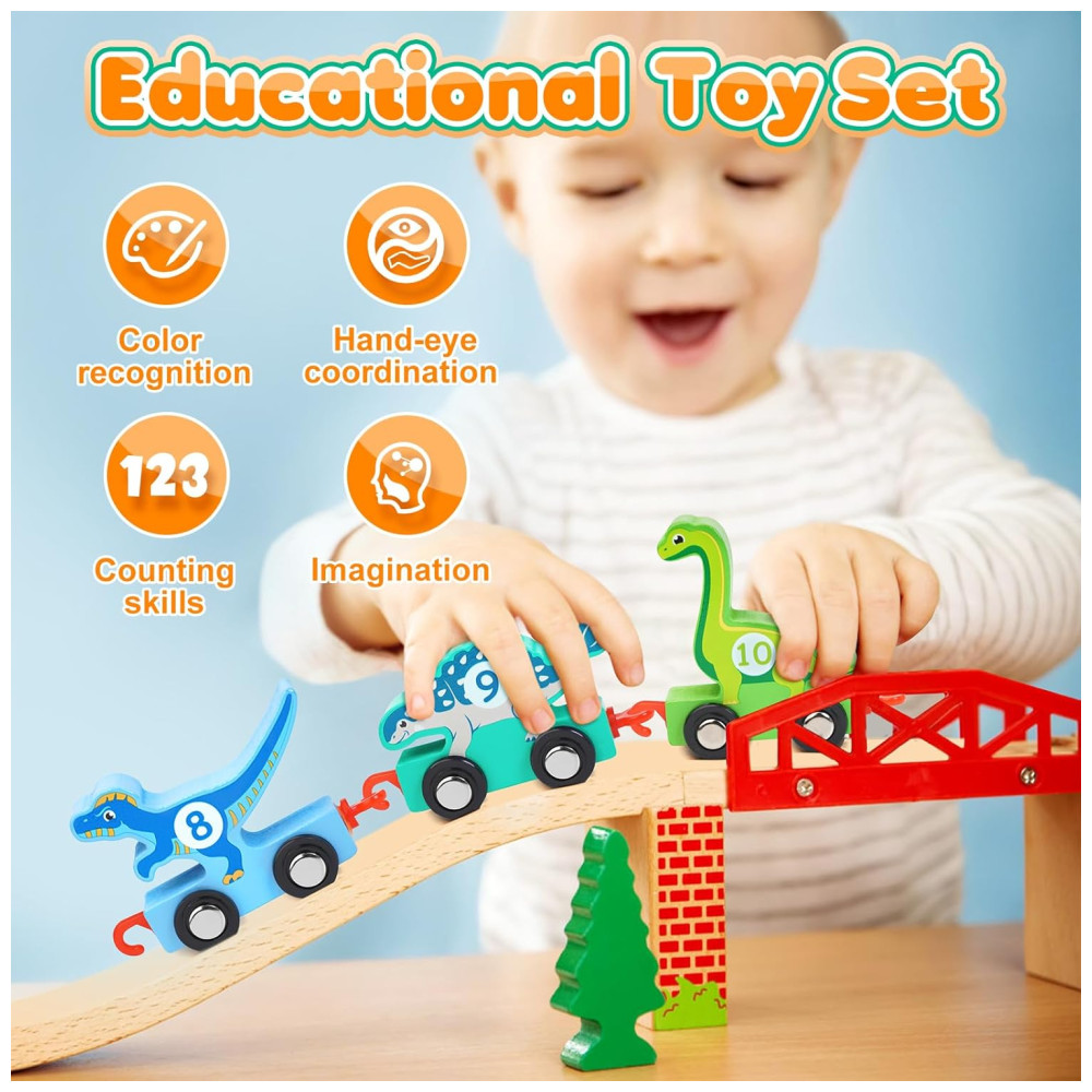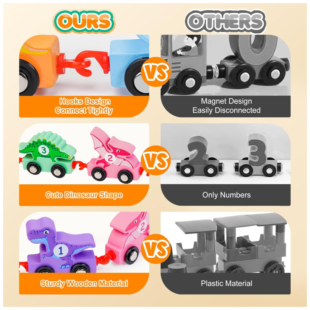O design de ganchos é mais forte do que o design de conexão magnética fraca, permitindo que as crianças conectem e desmontem facilmente, ajudando a exercitar suas habilidades motoras finas. Feito de madeira de alta qualidade e tinta à base de água não tóxica, sem cheiro ruim, a superfície foi cuidadosamente polida e as bordas são arredondadas para maior conforto das mãos do bebê. Este conjunto de trem de dinossauro é um ótimo presente para crianças que amam dinossauros, perfeito para aniversários, Natal, feriados e Halloween.