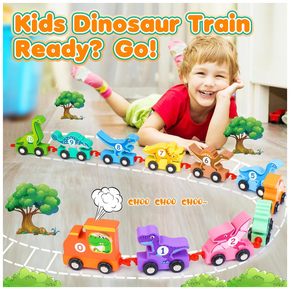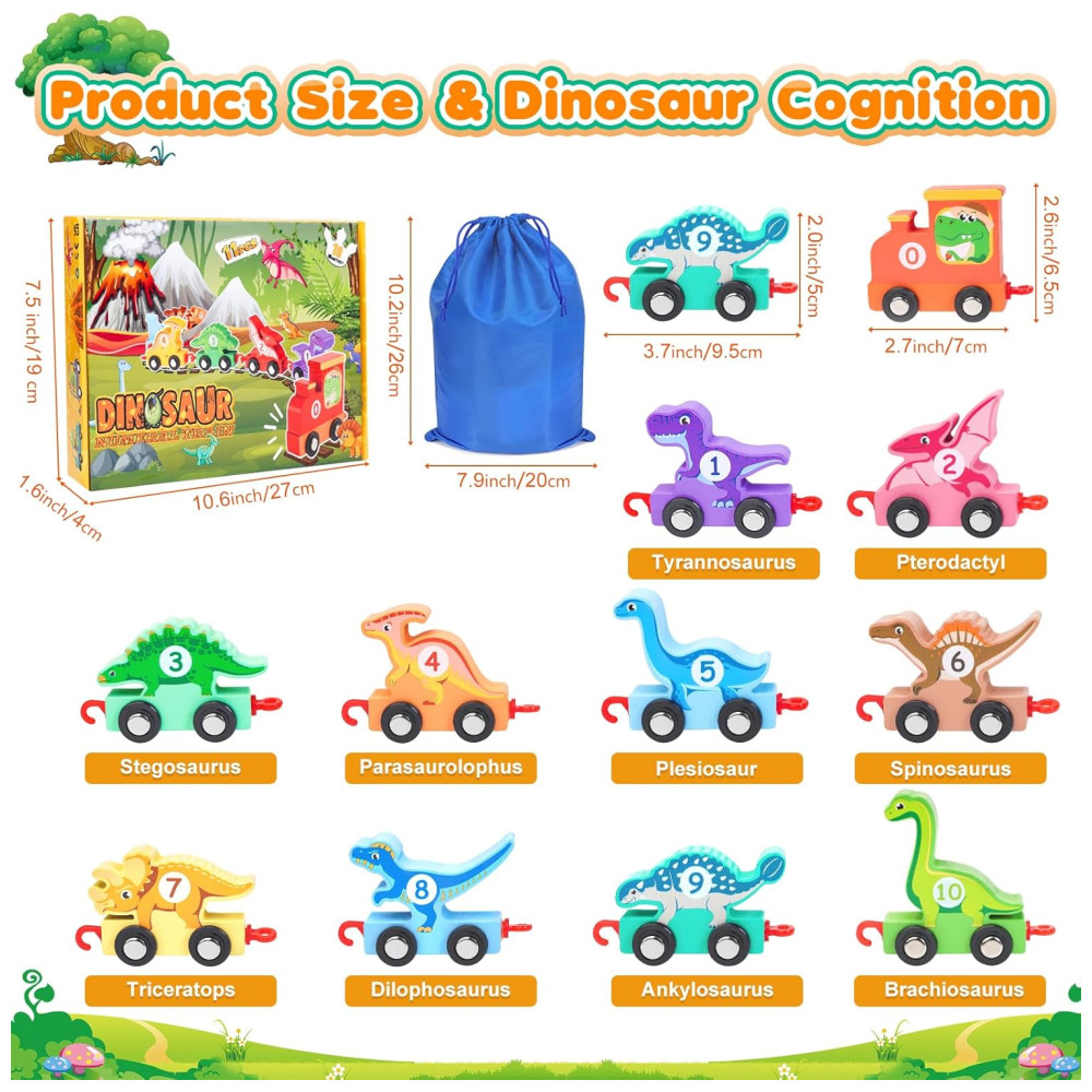Conjunto de trem de dinossauro perfeito para crianças de 2 a 5 anos O conjunto contém uma locomotiva e 10 vagões de dinossauros com padrões e números impressos em ambos os lados. Os temas fofos de dinossauros e cores brilhantes ajudam as crianças a identificar cores e aprender números, além de contar e classificar números de 1 a 10 desde cedo.