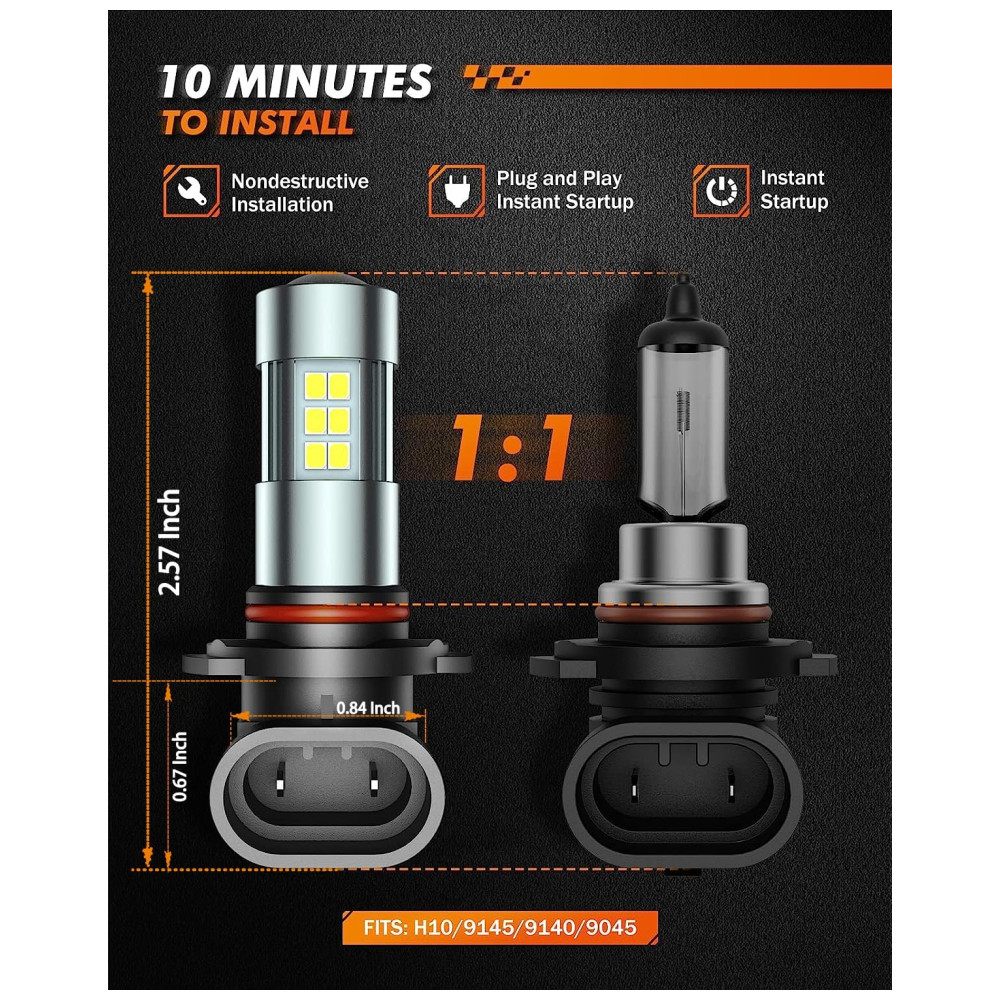 Ajuste Compatível com 9145, 9140, H10, 9045, 9040, PY20D como faróis de neblina ou DRL, combinando 98 dos veículos. Consulte o manual do proprietário do seu veículo ou procure localizador de lâmpadas automotivas para confirmar o modelo