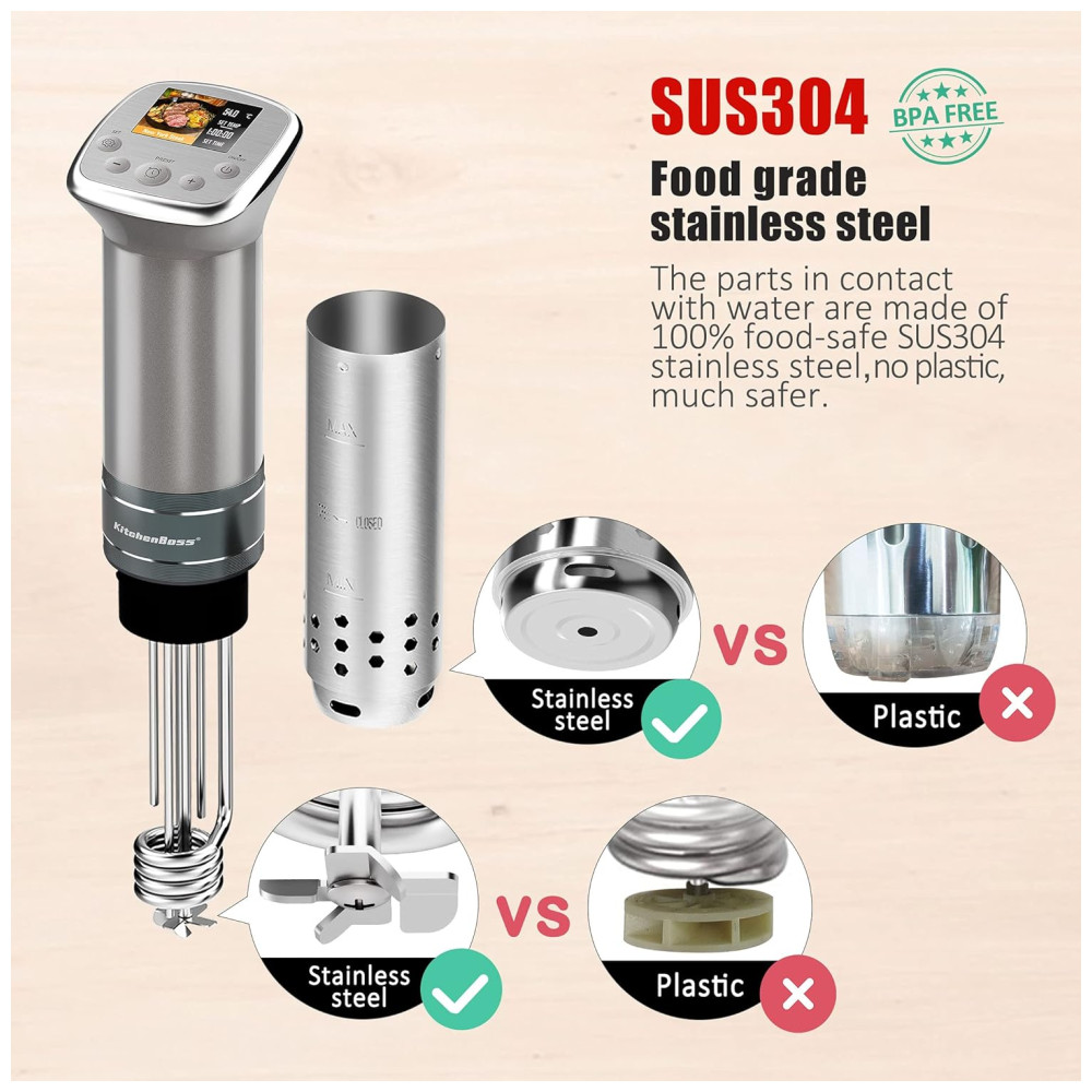 e sem ruído Toda a parte do sous vide em contato com a água é feita de aço inoxidável SUS304, o que não causa amarelecimento do material do produto devido ao longo tempo de uso, além de ser e durável. adota um design de ângulo de inclinação de 135 graus, com o orifício elíptico da manga, para reduzir o ruído