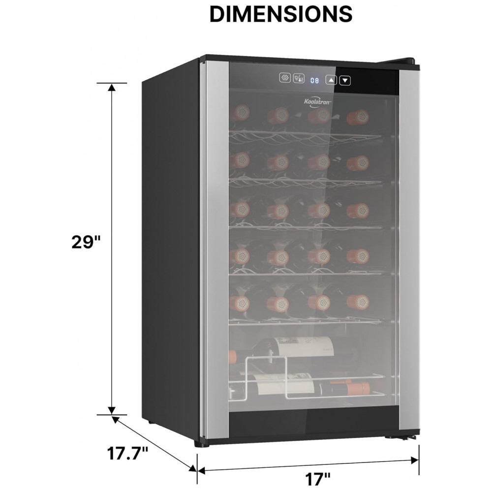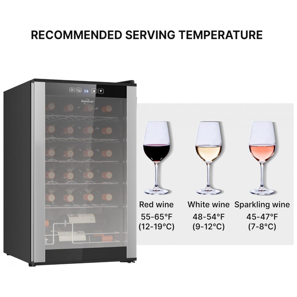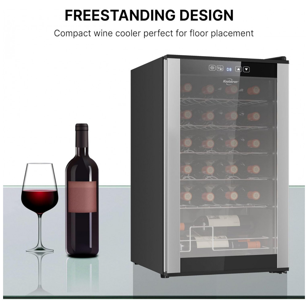 INSTALAÇÃO SIMPLES E FUNCIONAMENTO SILENCIOSO: A adega de vinho Koolatron foi projetada para uma configuração fácil, garantindo que os usuários possam rapidamente colocá-la em funcionamento sem complicações. Seu funcionamento silencioso a torna adequada para diversos ambientes, incluindo quartos e escritórios, onde os níveis de ruído precisam ser mantidos no mínimo. Seu tamanho compacto permite que se encaixe perfeitamente em pequenos espaços sem perturbar a decoração. Feita com orgulho na América do Norte, combina design inteligente com qualidade confiável. ZONA DE RESFRIAMENTO ÚNICA: A adega para vinho conta com uma única zona de resfriamento com uma faixa de temperatura consistente para armazenar vinhos brancos e tintos. Este design garante que sua coleção seja mantida na temperatura ideal. OPÇÕES DE ARMAZENAMENTO FLEXÍVEIS: As prateleiras removíveis da Koolatron são projetadas para acomodar diversos tamanhos de garrafas, inclusive as um pouco maiores. Este sistema flexível de armazenamento permite que os usuários guardem uma gama diversificada de vinhos sem se preocupar com problemas de encaixe. O design compacto e elegante da Koolatron permite que ela se encaixe bem em pequenos espaços, adicionando um toque de elegância ao ambiente. DISPLAY PARA 24 GARRAFAS DE VINHO: O Refrigerador de Vinhos Koolatron para 24 Garrafas apresenta prateleiras removíveis de aço inoxidável que podem acomodar garrafas maiores e formatos não padronizados. CONTROLES DE TOQUE DIGITAL: O painel de controle externo da adega de vinho Koolatron permite que os usuários ajustem a temperatura e operem a luz interior sem abrir a porta de vidro. PORTA DE VIDRO UV PROTECTIVE DOOR: A porta de vidro temperado do refrigerador de vinho Koolatron protege o vinho dos raios UV prejudiciais, que podem degradar a qualidade do vinho ao longo do tempo. COMPRESSOR DE ALTO DESEMPENHO: O Refrigerador de Vinhos Koolatron para 24 Garrafas é equipado com um compressor silencioso de baixa vibração que garante refrigeração confiável.