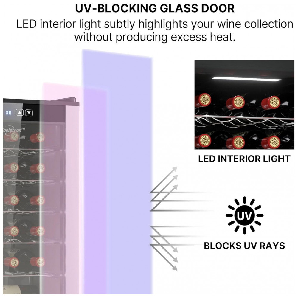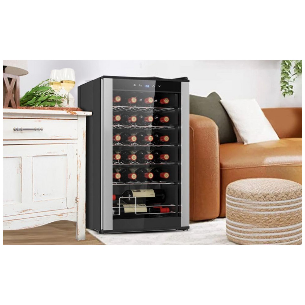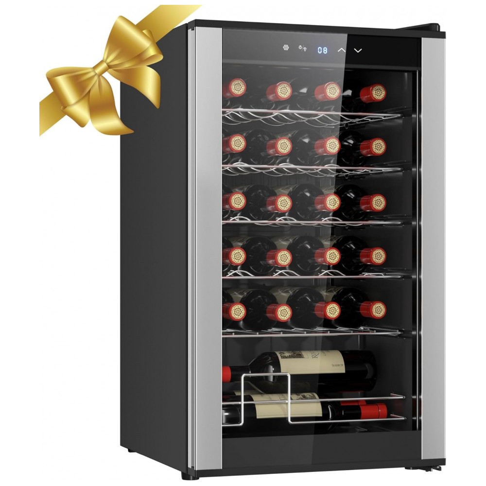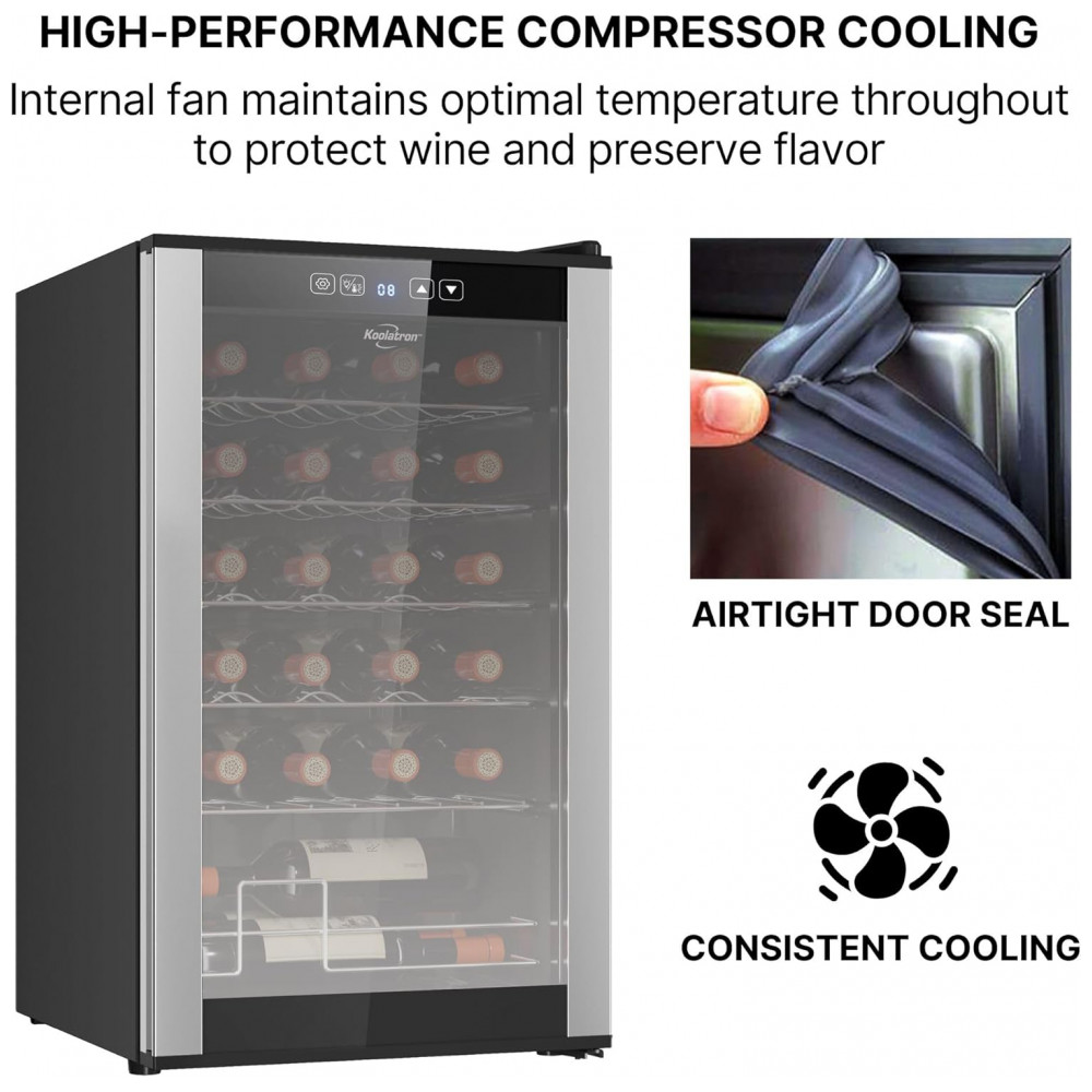 INSTALAÇÃO SIMPLES E FUNCIONAMENTO SILENCIOSO: A adega de vinho Koolatron foi projetada para uma configuração fácil, garantindo que os usuários possam rapidamente colocá-la em funcionamento sem complicações. Seu funcionamento silencioso a torna adequada para diversos ambientes, incluindo quartos e escritórios, onde os níveis de ruído precisam ser mantidos no mínimo. Seu tamanho compacto permite que se encaixe perfeitamente em pequenos espaços sem perturbar a decoração. Feita com orgulho na América do Norte, combina design inteligente com qualidade confiável. ZONA DE RESFRIAMENTO ÚNICA: A adega para vinho conta com uma única zona de resfriamento com uma faixa de temperatura consistente para armazenar vinhos brancos e tintos. Este design garante que sua coleção seja mantida na temperatura ideal. OPÇÕES DE ARMAZENAMENTO FLEXÍVEIS: As prateleiras removíveis da Koolatron são projetadas para acomodar diversos tamanhos de garrafas, inclusive as um pouco maiores. Este sistema flexível de armazenamento permite que os usuários guardem uma gama diversificada de vinhos sem se preocupar com problemas de encaixe. O design compacto e elegante da Koolatron permite que ela se encaixe bem em pequenos espaços, adicionando um toque de elegância ao ambiente. DISPLAY PARA 24 GARRAFAS DE VINHO: O Refrigerador de Vinhos Koolatron para 24 Garrafas apresenta prateleiras removíveis de aço inoxidável que podem acomodar garrafas maiores e formatos não padronizados. CONTROLES DE TOQUE DIGITAL: O painel de controle externo da adega de vinho Koolatron permite que os usuários ajustem a temperatura e operem a luz interior sem abrir a porta de vidro. PORTA DE VIDRO UV PROTECTIVE DOOR: A porta de vidro temperado do refrigerador de vinho Koolatron protege o vinho dos raios UV prejudiciais, que podem degradar a qualidade do vinho ao longo do tempo. COMPRESSOR DE ALTO DESEMPENHO: O Refrigerador de Vinhos Koolatron para 24 Garrafas é equipado com um compressor silencioso de baixa vibração que garante refrigeração confiável.