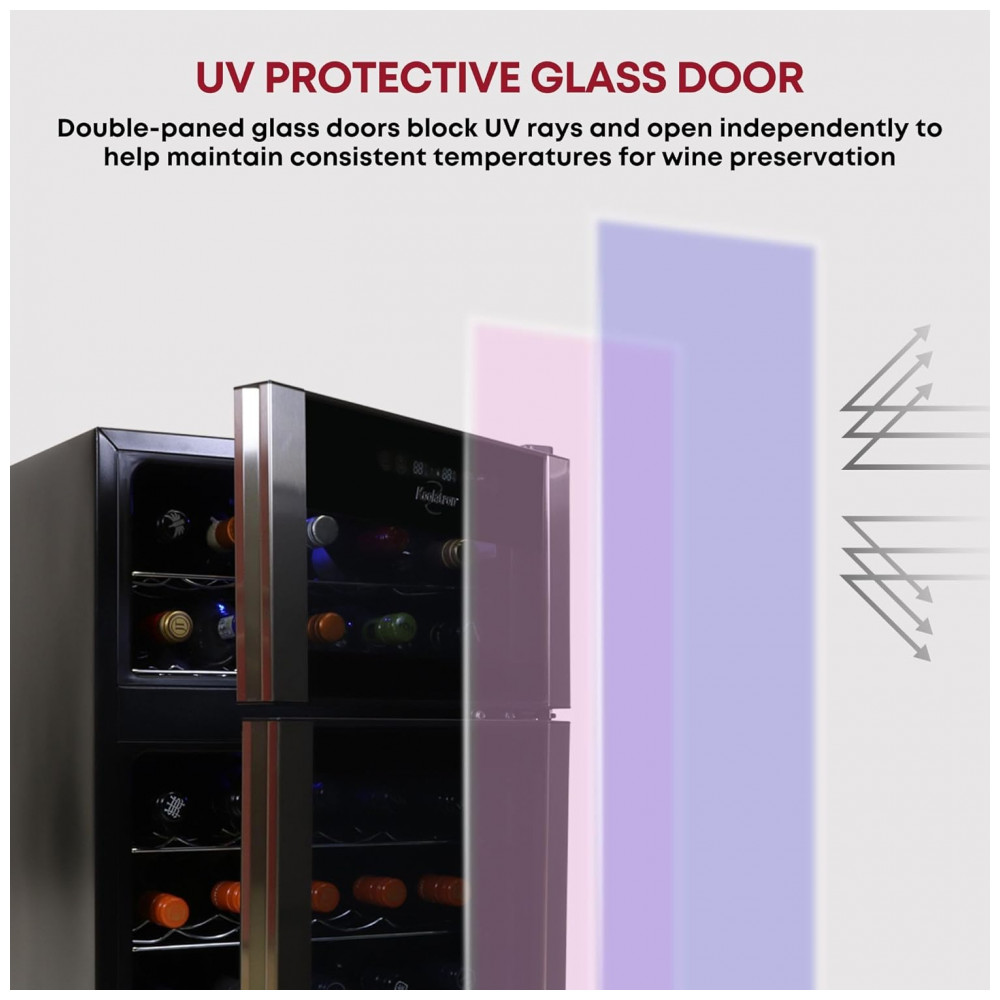 Desfrute de vinhos sempre na temperatura ideal com o refrigerador de vinho Koolatron. Com design autônomo, tecnologia de compressor de alto desempenho e capacidade para 24 garrafas, este refrigerador oferece refrigeração eficiente para suas bebidas favoritas. Com duas zonas de resfriamento separadas, você pode personalizar o ambiente de armazenamento perfeito para diferentes tipos de vinhos, preservando seu sabor e qualidade. Além disso, as portas de vidro duplas bloqueiam raios UV e calor, garantindo condições ideais de armazenamento. Com controles de tela sensível ao toque, operação silenciosa e prateleiras ajustáveis, este refrigerador de vinhos combina funcionalidade, estilo e qualidade.