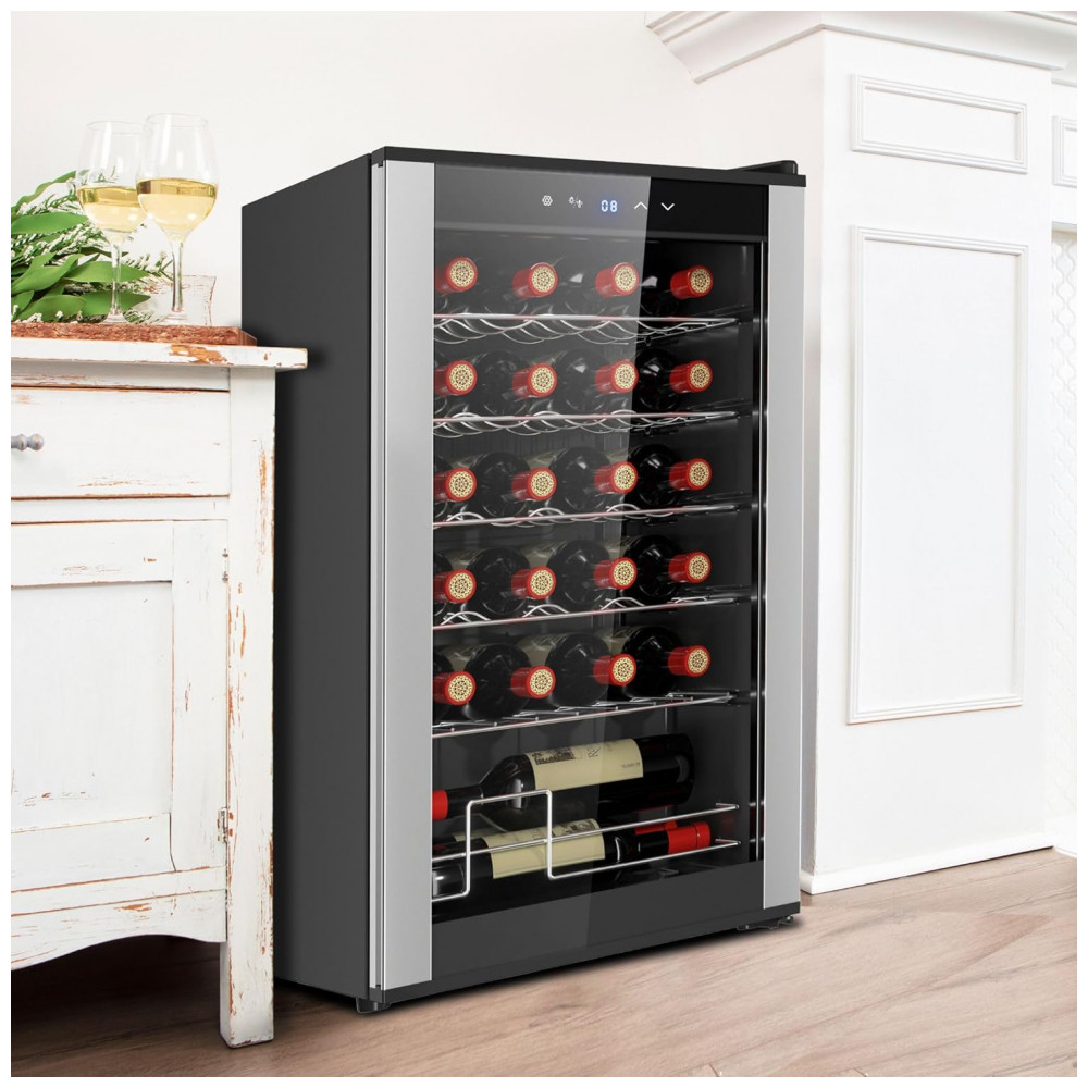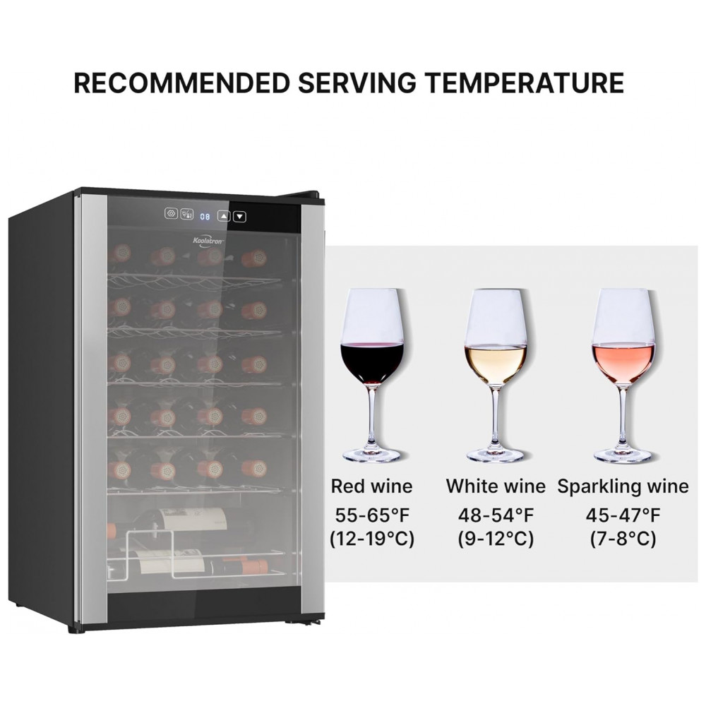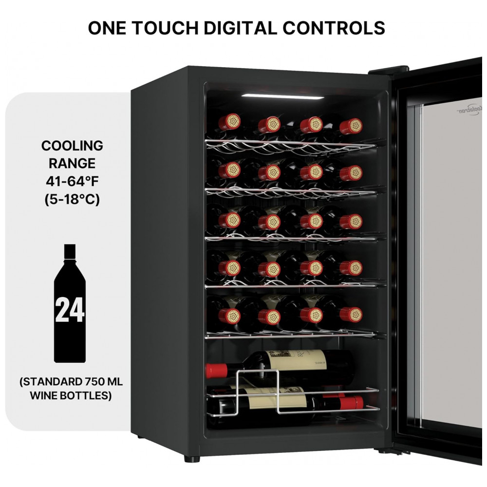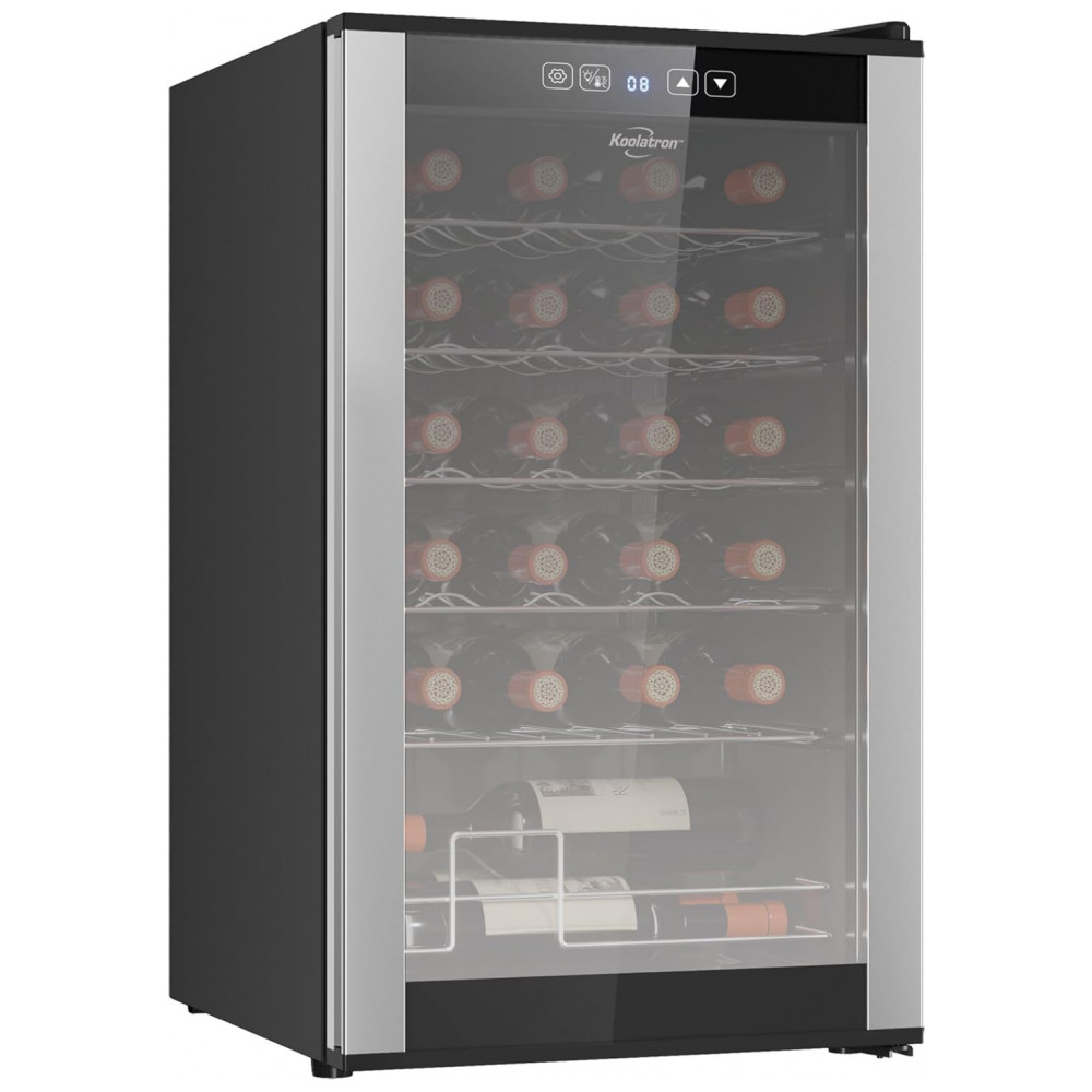 Armazene e exiba com elegância 24 garrafas de vinho com a Geladeira de Vinhos Koolatron, que possui prateleiras removíveis de aço inoxidável que acomodam garrafas maiores e formatos não convencionais. Com um suporte de exibição horizontal, é fácil identificar e acessar seus vinhos favoritos. Com opções flexíveis de armazenamento, prateleiras deslizantes e racks ajustáveis, você pode guardar uma variedade de vinhos com facilidade. O design compacto e elegante se encaixa perfeitamente em qualquer ambiente, proporcionando refrigeração eficaz e silenciosa para manter seus vinhos na temperatura ideal. Possui zona de resfriamento única, controles digitais de toque, porta de vidro UV protetora, compressor de alta performance, sistema de auto-descongelamento.