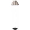 Luminária de piso com haste metálica preta e cúpula plissada em tecido bege, com altura aproximada de 154 cm, adequada para salas, quartos, escritórios e outros ambientes internos. A base metálica circular garante estabilidade e o design minimalista contribui para composição de espaços modernos e discretos.
