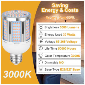 Economize dinheiro com as lâmpadas de milho LED de 30W da ELIVERN, reduzindo em 90% sua conta de energia ao substituir sua lâmpada incandescente de 100W. Com luz branca quente de 3000K, a lâmpada é super brilhante, proporcionando iluminação instantânea e equivalente a várias lâmpadas LED de 100W. Fabricada com alumínio de aviação para excelente dissipação de calor, tecnologia LED de corrente constante inteligente e longa vida útil. A lâmpada não possui cintilação, é ecofriendly e saudável para os olhos. Ideal para uso em diferentes ambientes: residenciais, comerciais, internos e externos.
