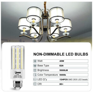 A lâmpada de milho LED de alta luminosidade de 40W equivale a uma lâmpada incandescente de 300W, proporcionando economia de energia. Com incríveis 5000 lumens de saída de luz e iluminação omnidirecional de 360 graus, abrange uma área maior. Possui longa vida útil devido ao corpo de alumínio com excelente condutividade térmica e tecnologia LED de corrente constante inteligente. Com 5000 lumens de brilho intenso, ilumina grandes áreas com 100lm/watt, destacando-se pela intensidade. A base da lâmpada de milho é feita de material PC, resistente ao calor e com alta resistência a chamas. Design único em formato de milho para iluminação ampla, base média E26E27 para fácil instalação. Ideal para uso em garagens, armazéns, jardins, pátios, celeiros, lojas, estações, escolas, hospitais, restaurantes, hotéis e mais.