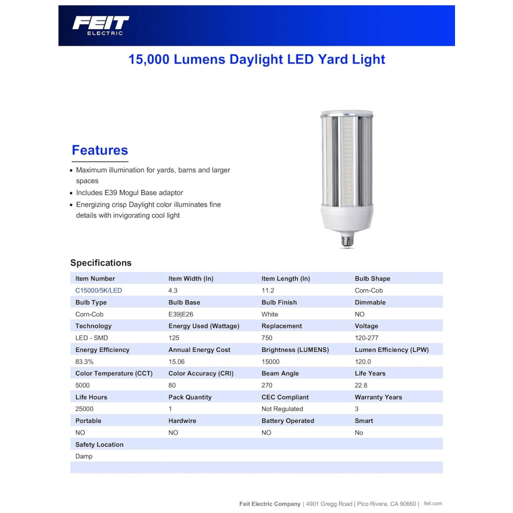 LUZ DO DIA A lâmpada Feit LED oferece cores brilhantes e nítidas para iluminar espaços maiores em CCT de 5000 Kelvin As lâmpadas são mais adequadas para uso em escritórios, oficinas, banheiros ou outras áreas onde a visibilidade de detalhes é importante