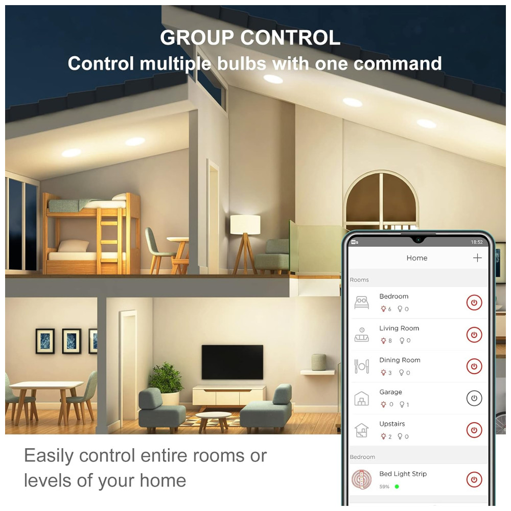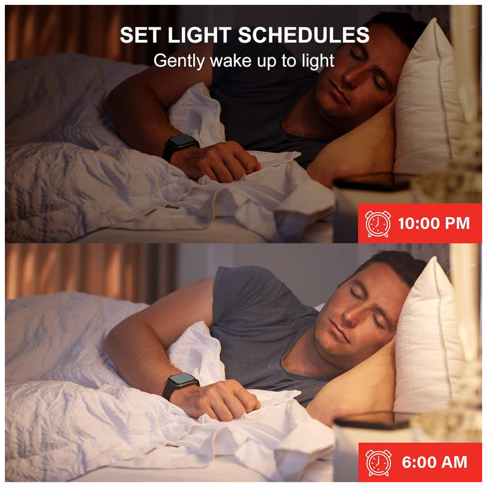 Modo Acordar e Dormir Você pode organizar suas lâmpadas alexa para ligar automaticamente quando você acordar ou desligar quando adormecer através do aplicativo móvel. Dentro do intervalo de tempo que você definir, sua lâmpada irá escurecer ou iluminar lentamente. Automatize suas configurações de iluminação doméstica inteligente